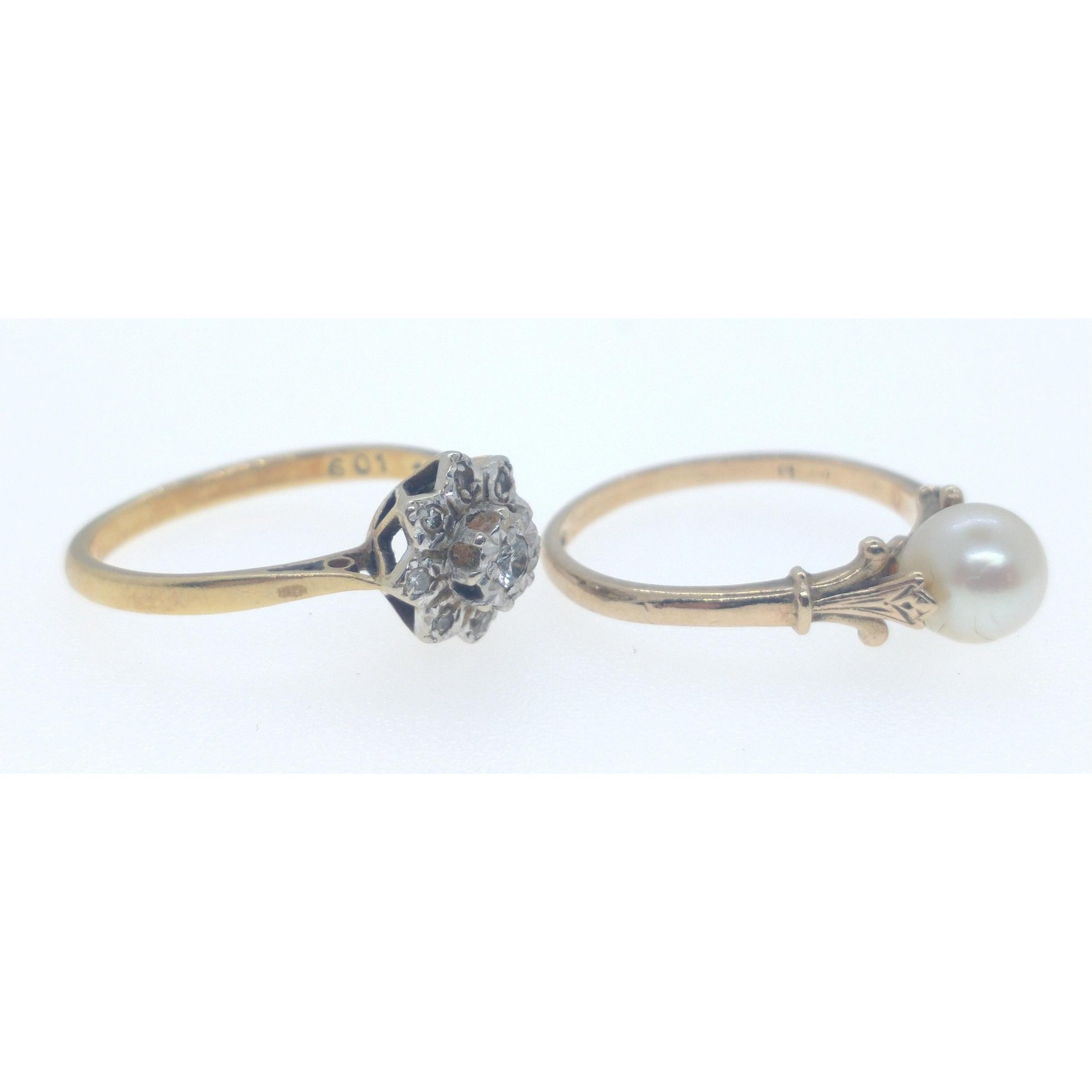Two rings, both vintage, one an engagement ring 18ct stamped with central small diamond (tested) 2.70g gross weight ring size N/O, the other a dainty pearl inset ring size N weight 1.88g gross