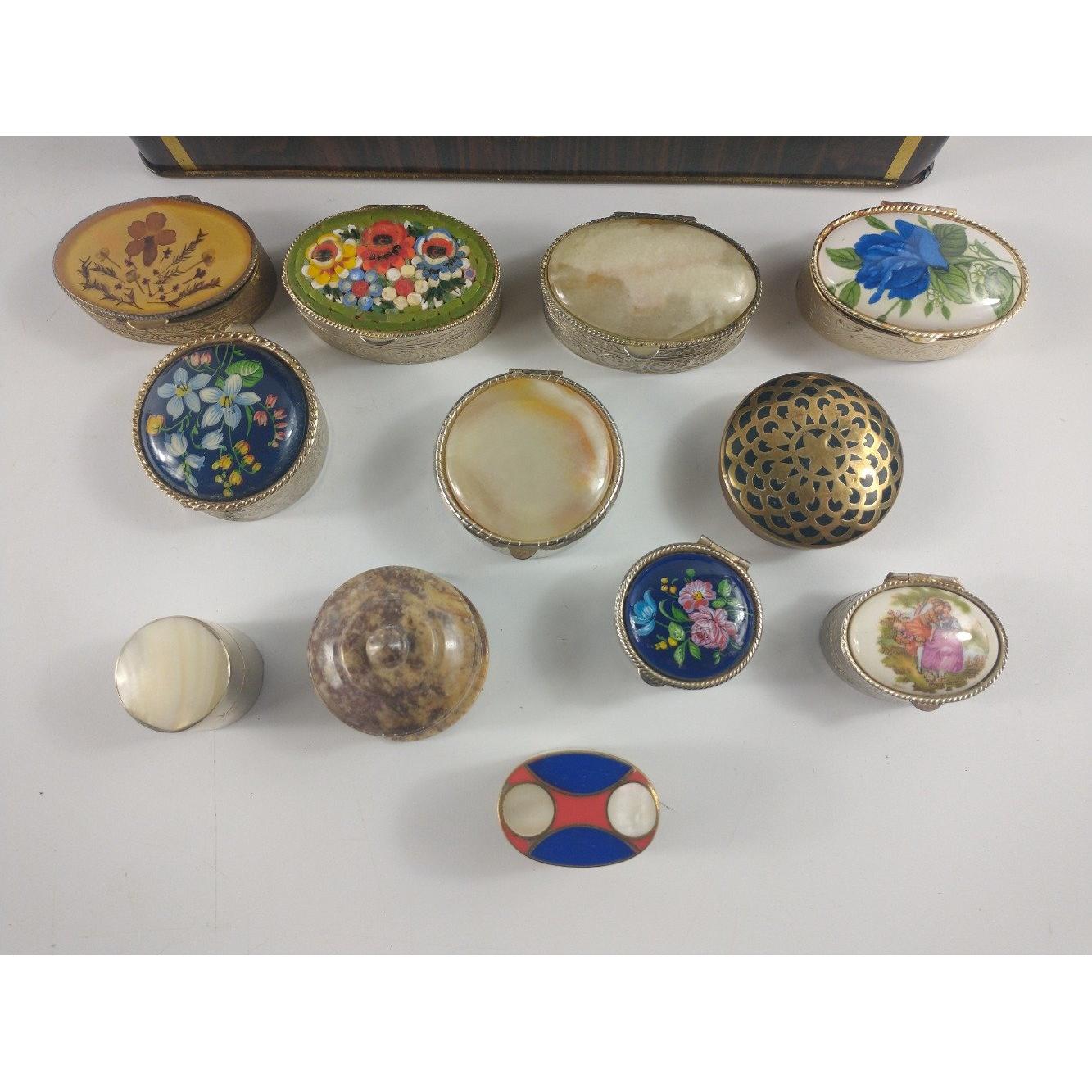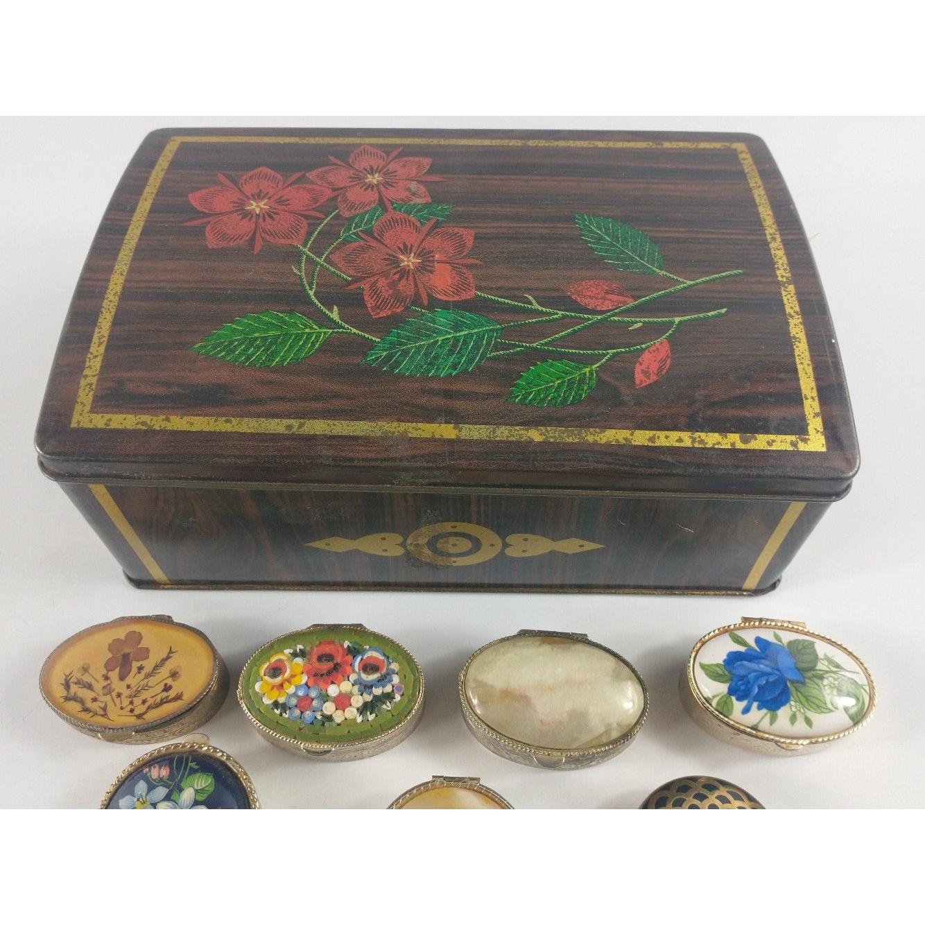 A vintage tin box with 12 assorted PILL BOXES agate, French, silver plate, mosaic, floral etc.