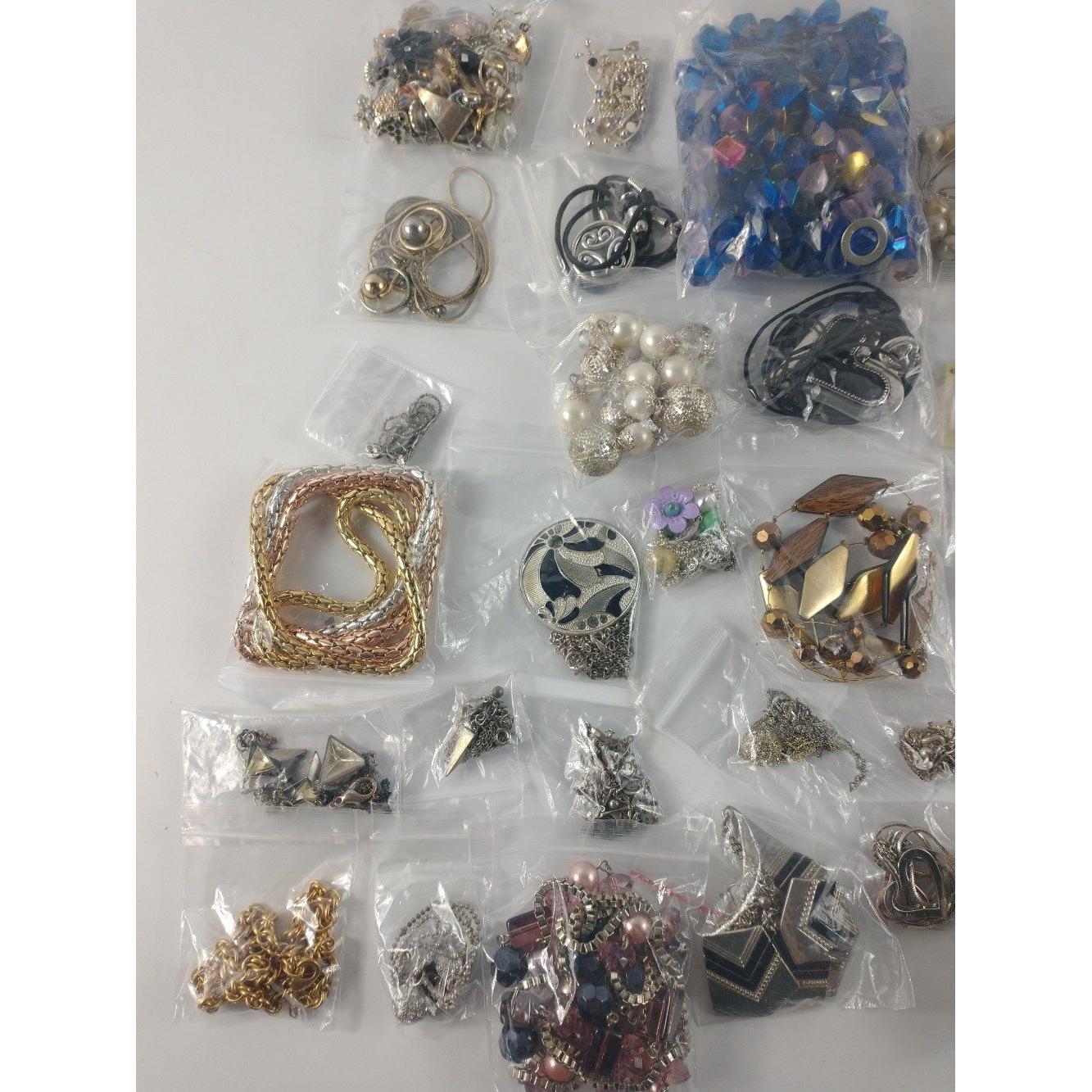 A bag jammed- full of costume jewellery along with a white wire-painted heart to display it all. Includes necklaces, beads, bracelets etc.Approx 2 pieces