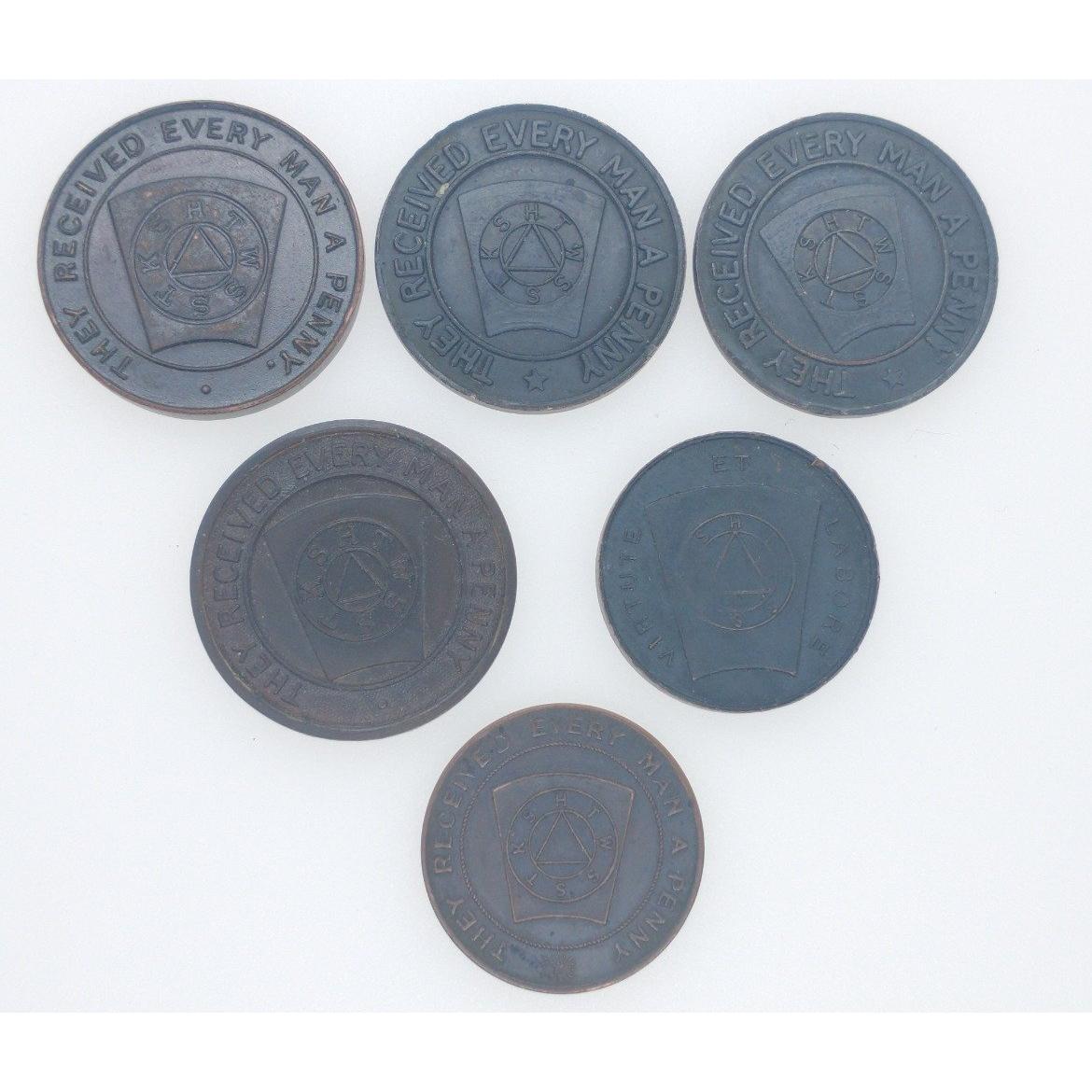 MASONIC & LOCAL INTEREST 'They received Every Man A Penny' Masonic Freemason's Mark Token's from The Lodge Of ERCILDOUNE (EARLSTON TOWN SCOTTISH BORDERS)No 1119 x 3 qty, also Masonic Mark Token from EAST LINTON /TYNESIDE LODGE No 714 (DORMANT LODGE) qty 1, also GOREBRIDGE/DUNDAS Lodge No 1039 and lastly Kyle and Bute? No 1120 Mark Token