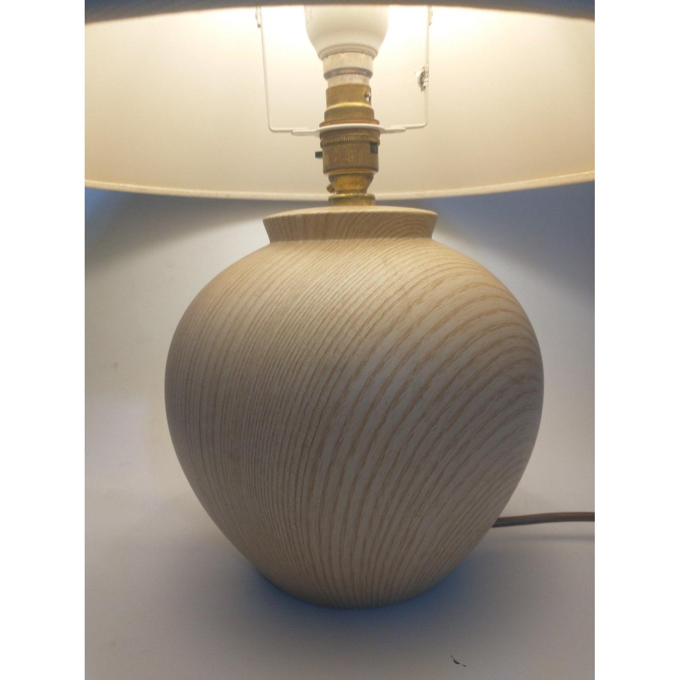 Table lamp with wood effect base and cream calico effect shade. Stands approx. 40cm high.