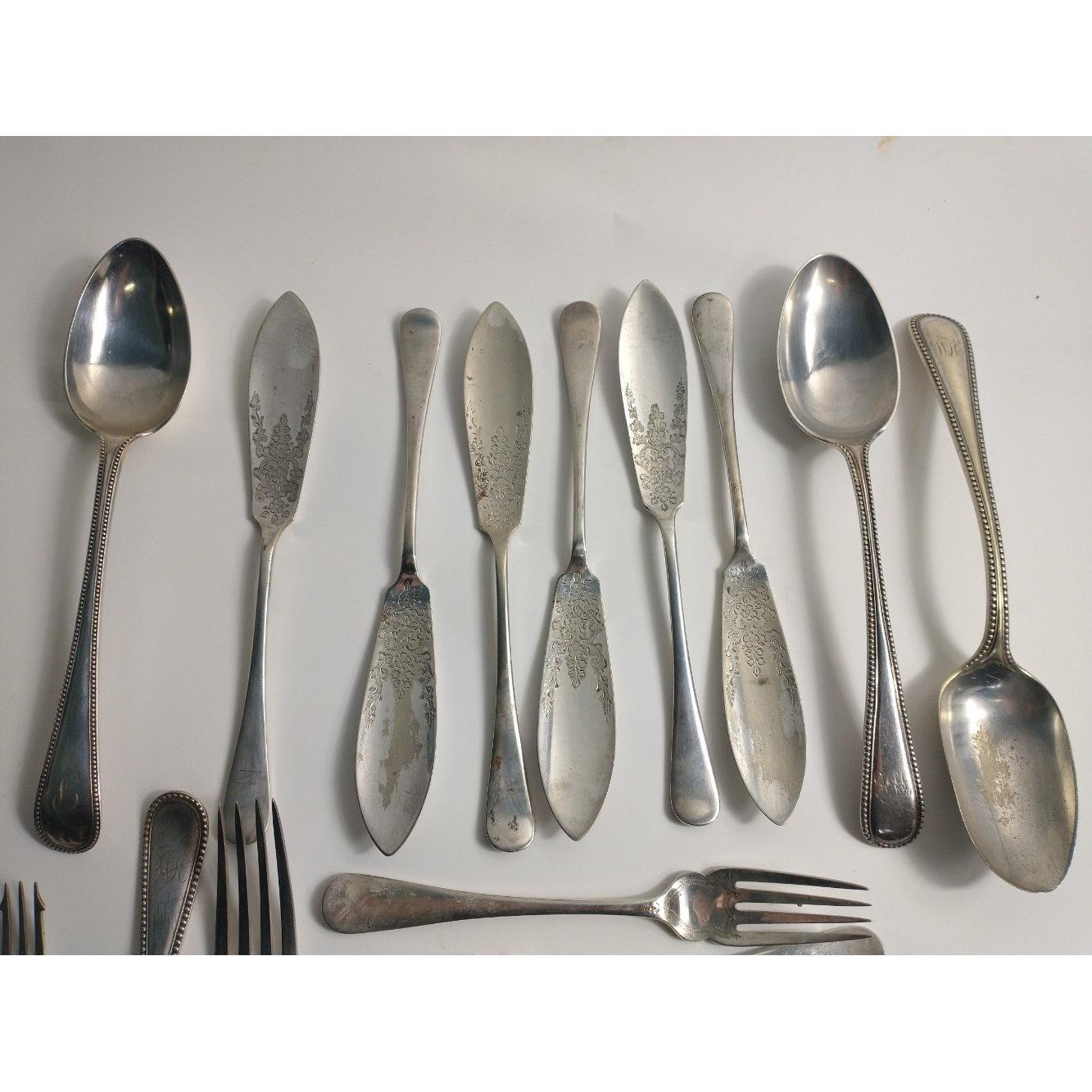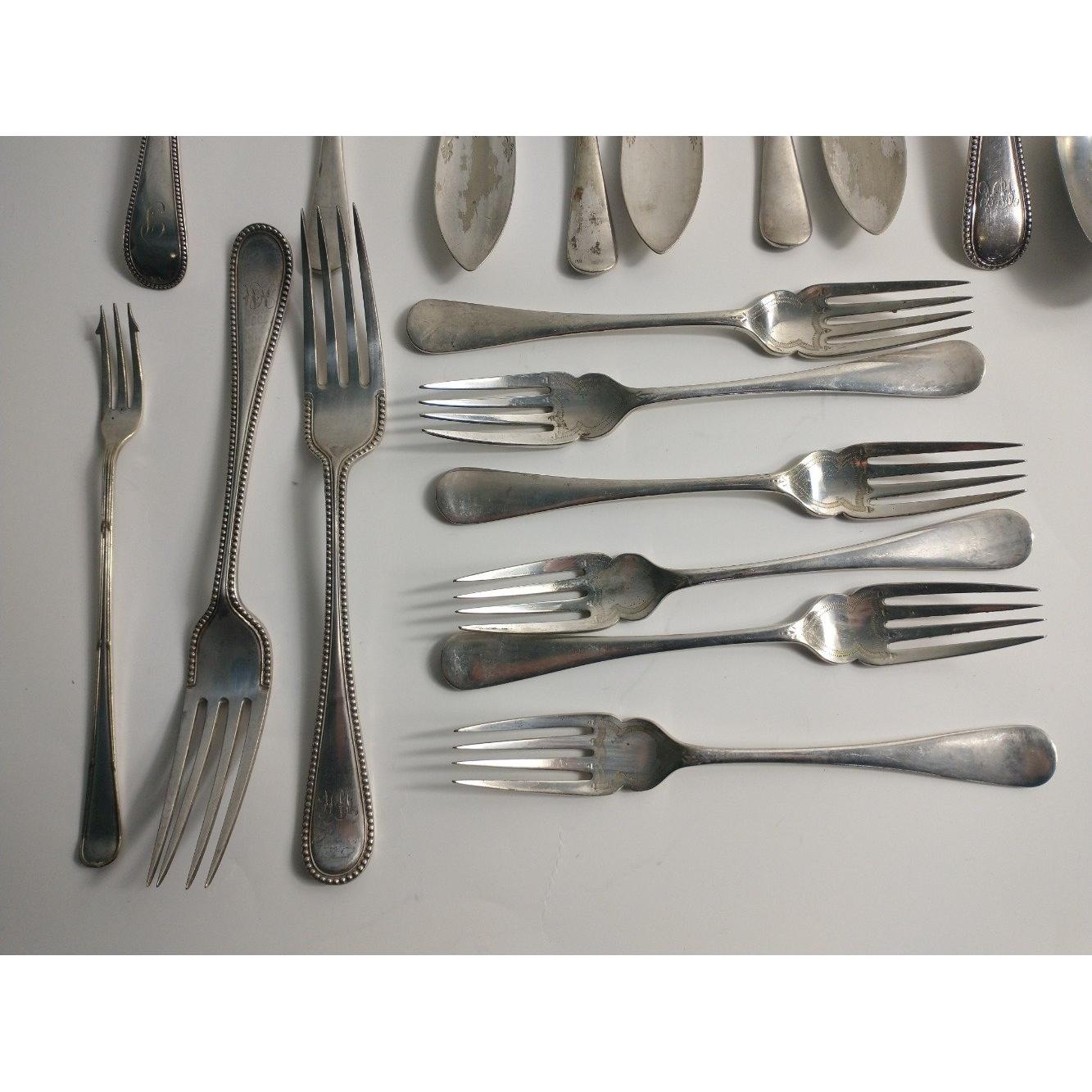 Six late Victorian silver plated fish knives and forks made by Charles James Allen & Sidney Darwin of Sheffield, 3 monogrammed silver plate serving spoons and 2 silver serving spoons by WALKER & HALL, and 1 EPNS pickle fork
