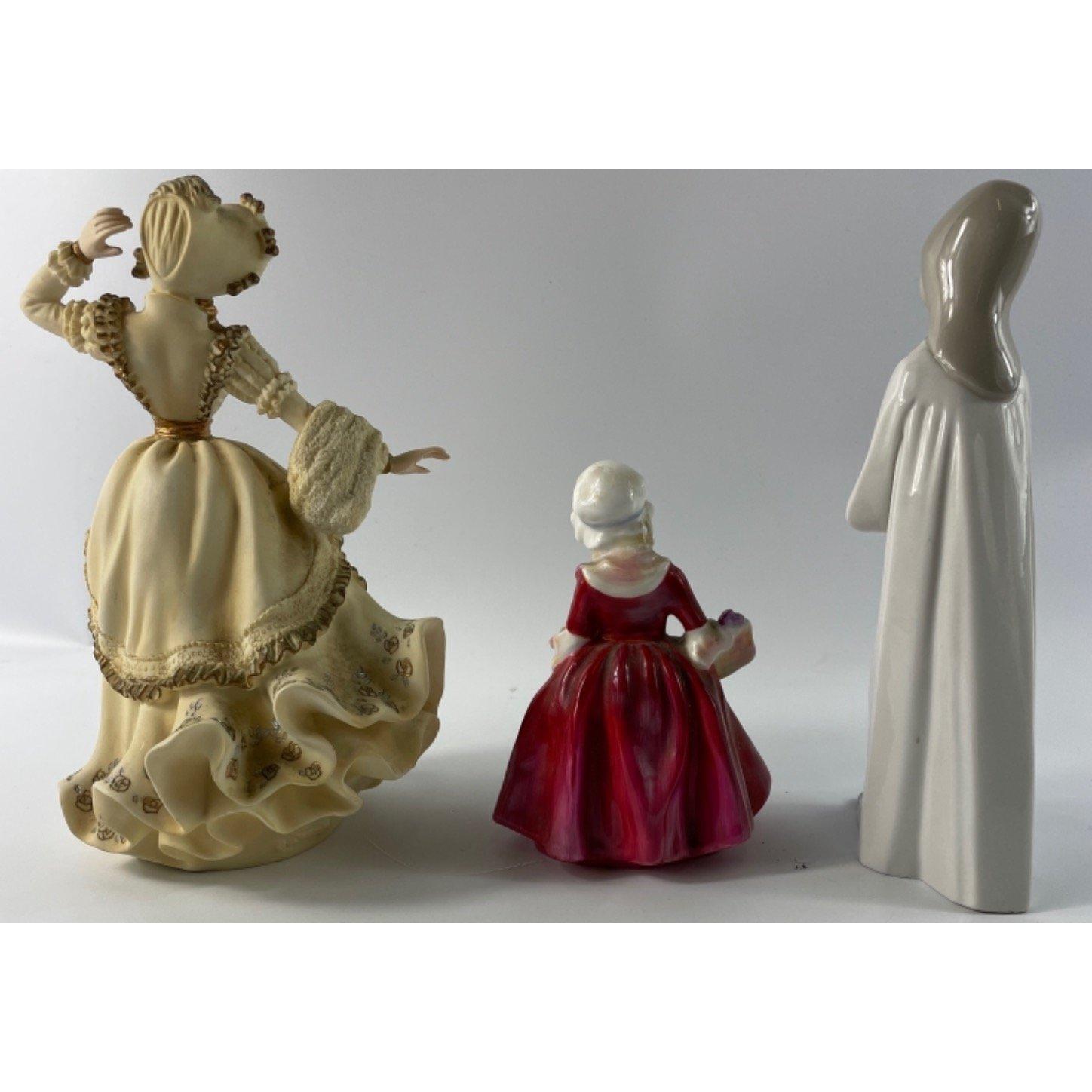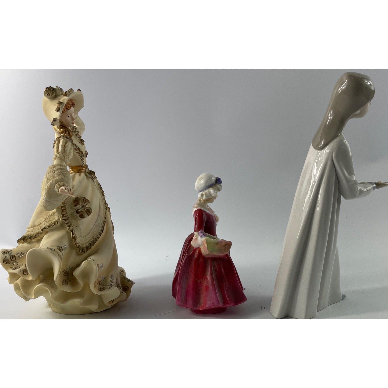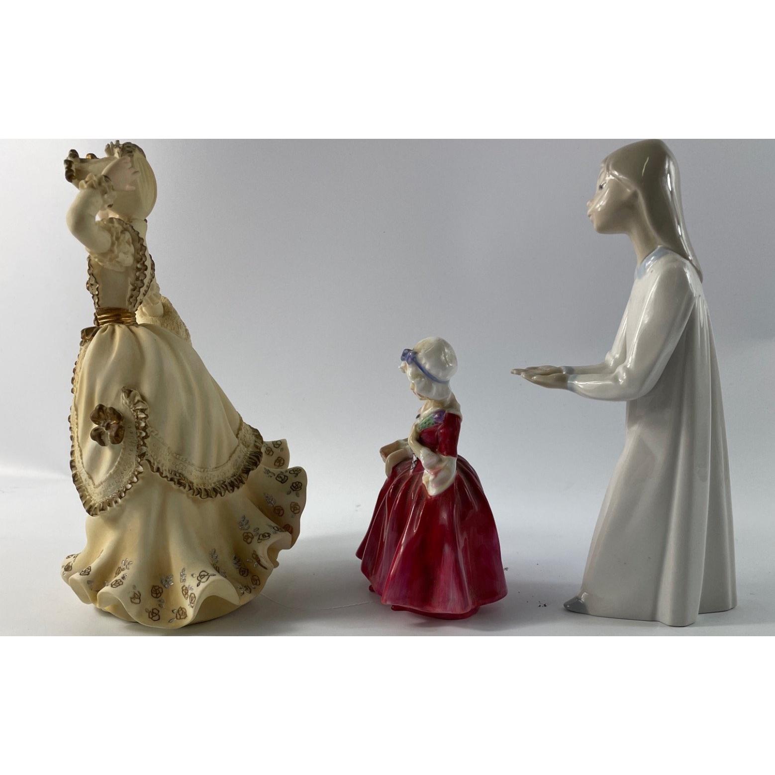 Small collection of lovely ladies to include ROYAL DOULTON "Lavinia" HN 1955 (approx. 13cm tall), LLADRO girl with hands out (approx. 20cm high) and "Winter Breeze" from the Leonardo Collection (approx 21cm tall)