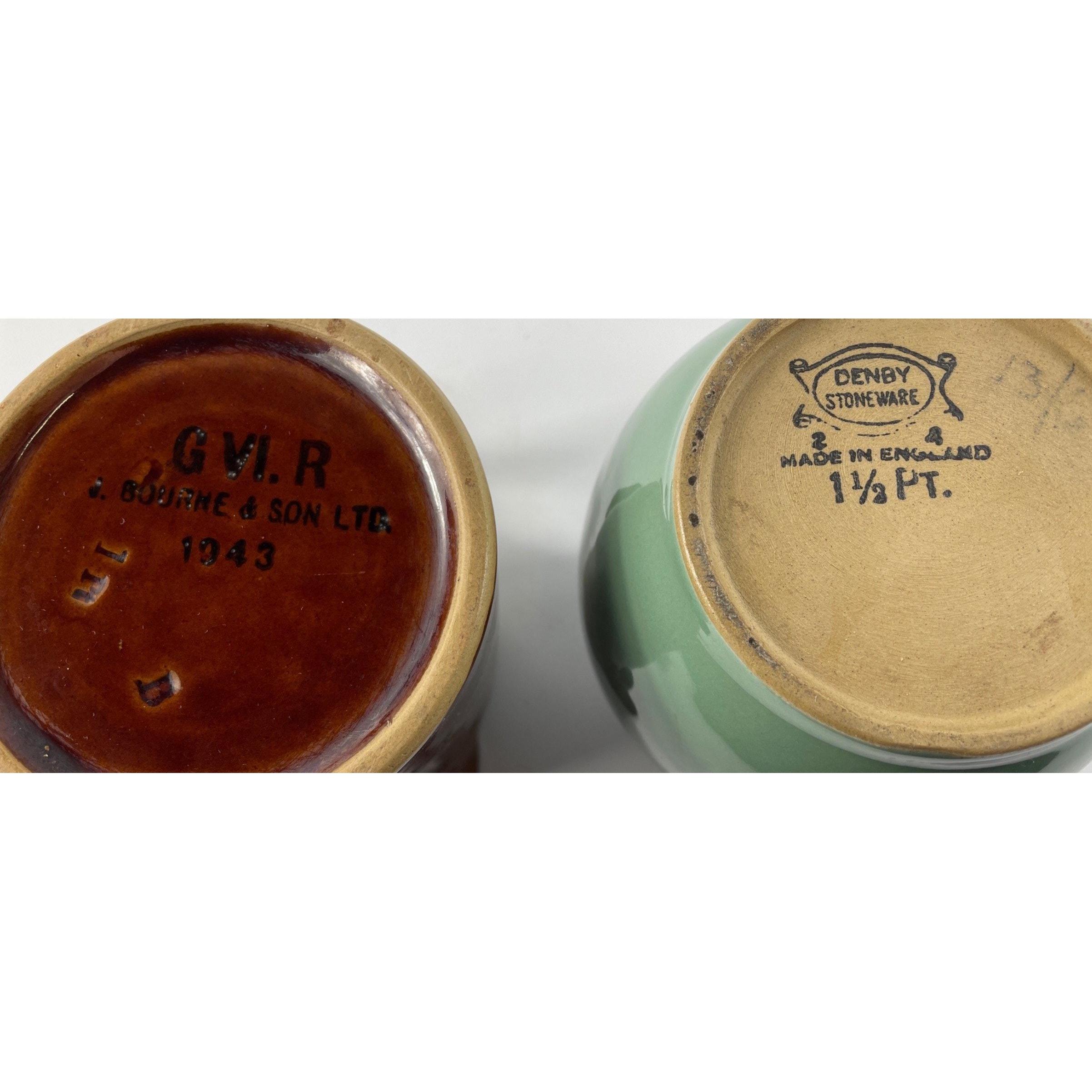 Two vintage COFFEE POTS - 1 brown one pint jug by V. Bourne & Son stamped G Vl R 1943, the other 1.5 pint by Denby.Approx 2 pieces