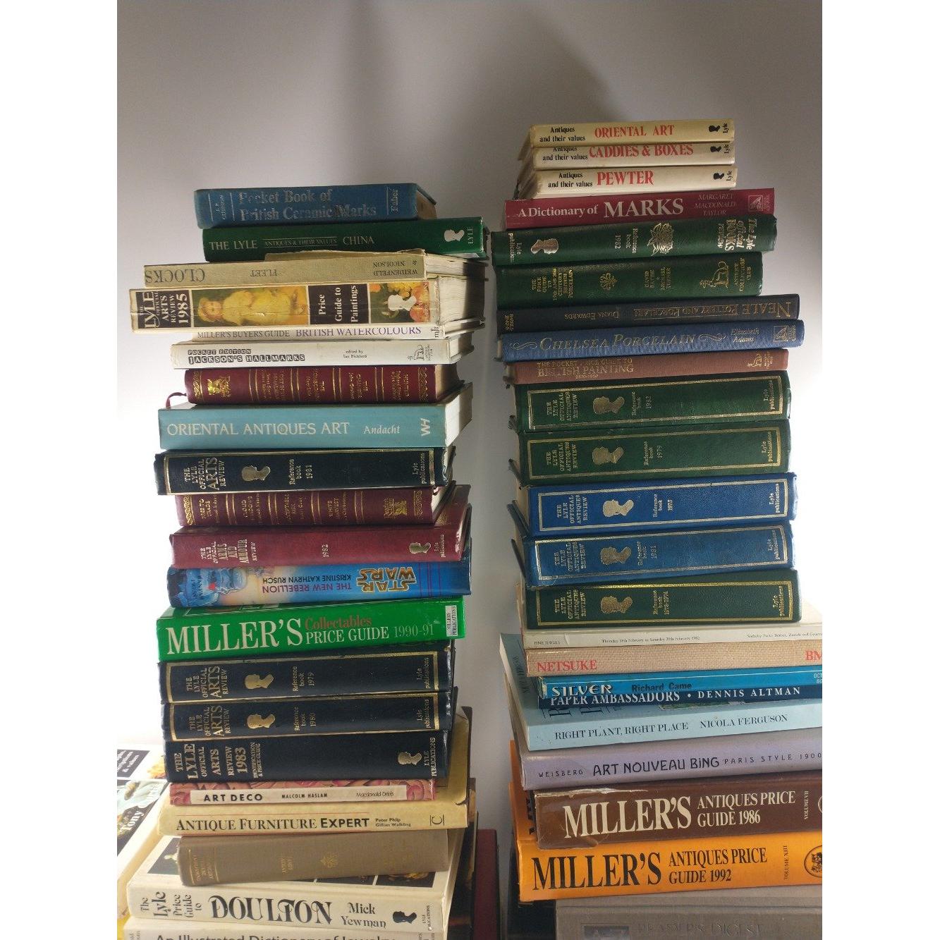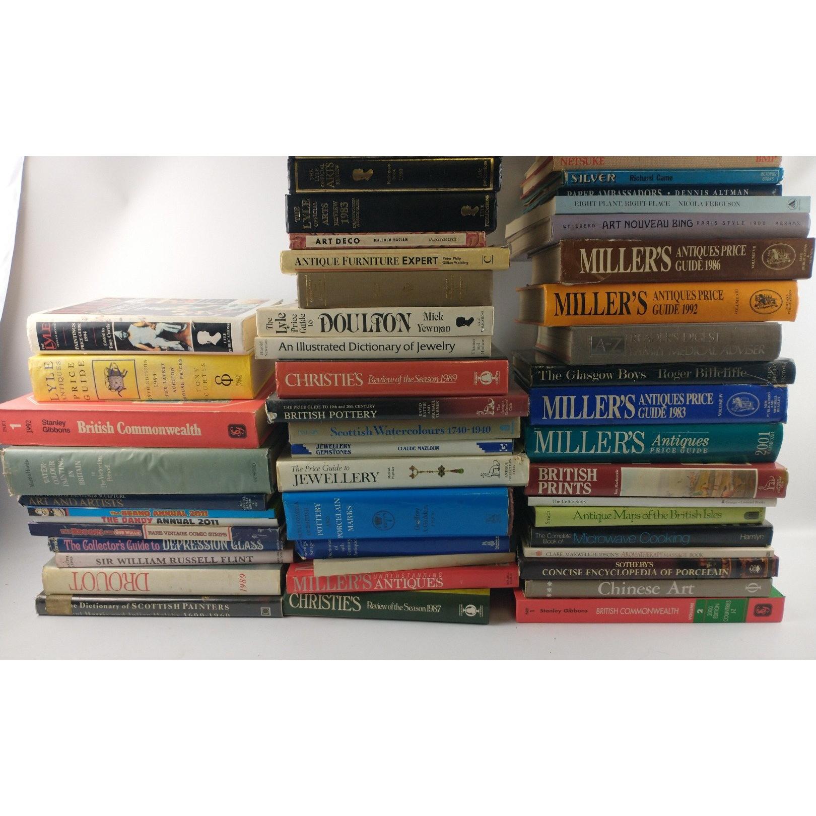 A large collection of three boxes of mixed books to include the Sotheby catalogue of the jewellery sale held in St Moritz in Feb 1982 - beautiful jewellery to admire; learn more about Japanese Netsuke and learn from the Sotheby experts about porcelain. Also catch up on the adventures of the Beano plus various Lyle antique price guides.