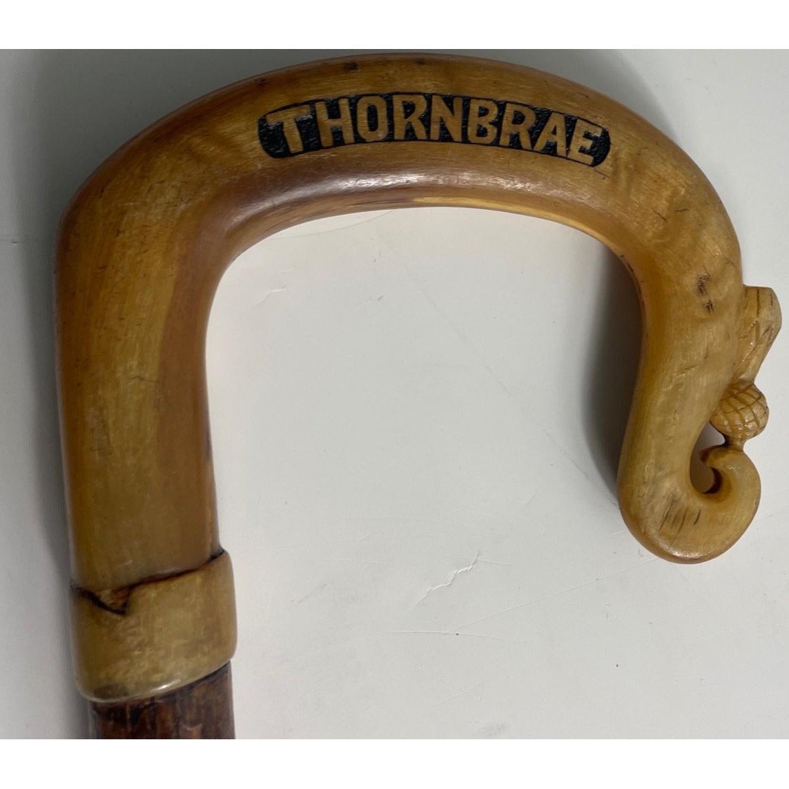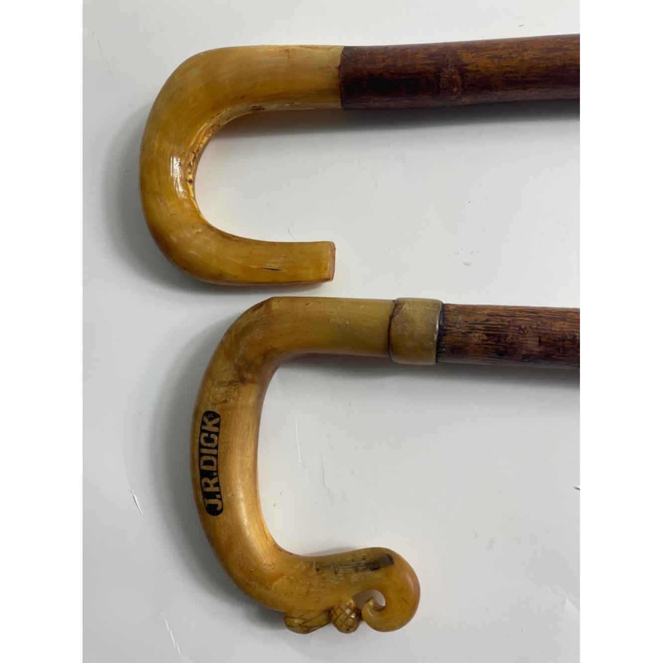 One walking stick and one CROOK sized - one 90cm approx., horn handle with thistle detail stamped J.R. Dick Thornbrae, the other 115cm approx. also with horn handleApprox 2 pieces