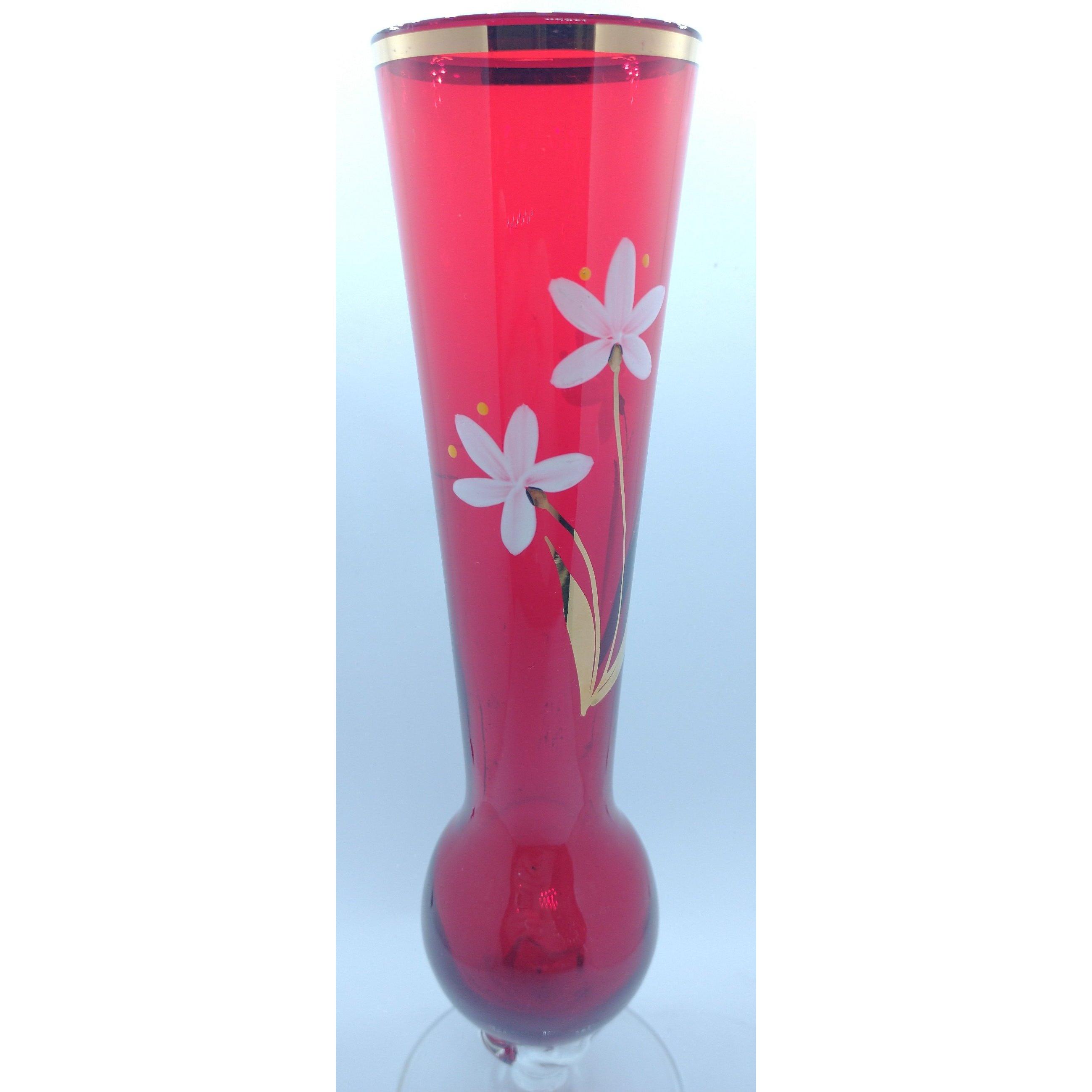 Pair of red fine-glass hand-painted vases (approx. 20cm tall) with small vase (approx. 9cm high)Approx 3 pieces