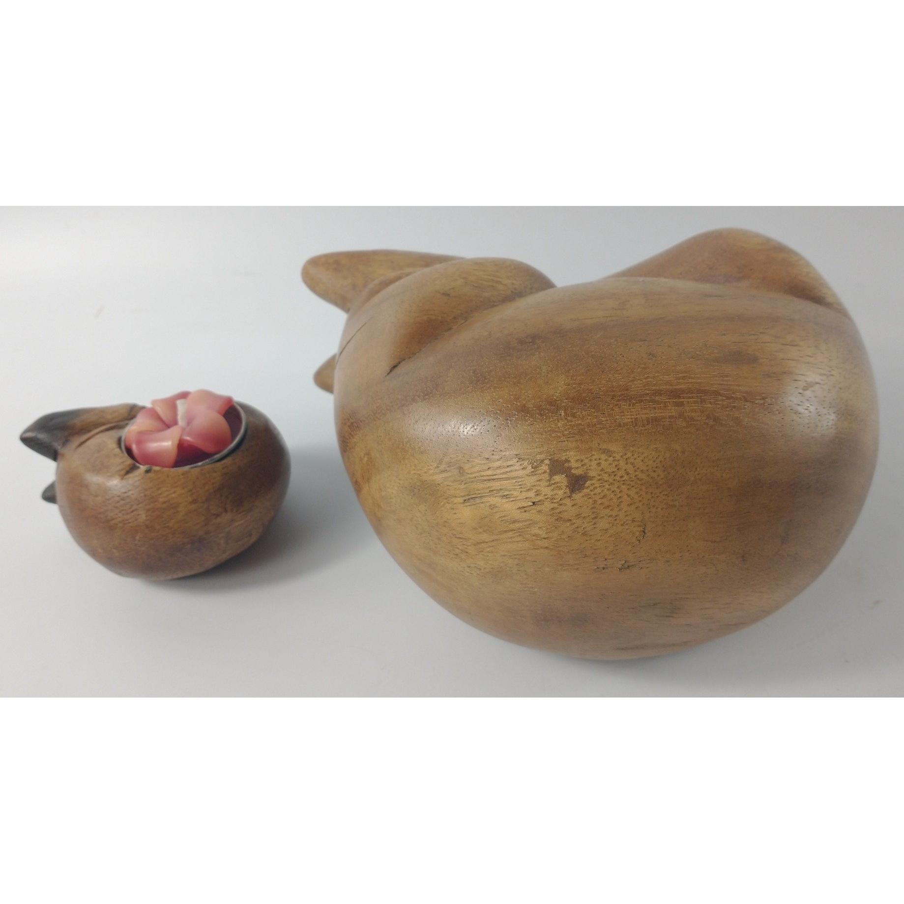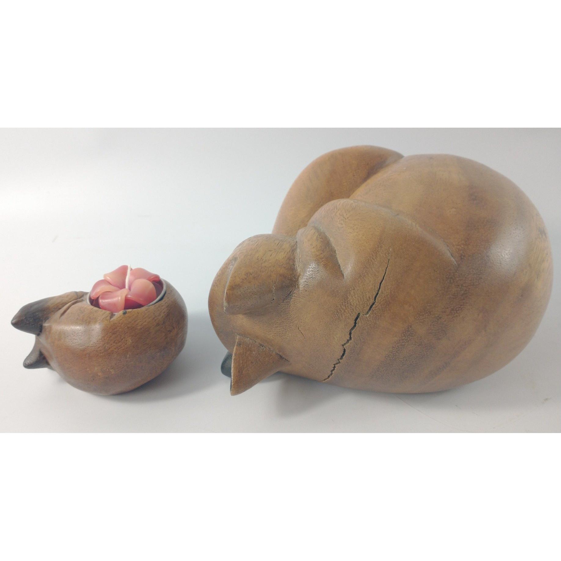 Pair of beautiful solid wooden cats enjoying a snooze, one is approx. 14 x 16 cm, the other holds a tealight and stands approx. 7cm high.Approx 2 pieces