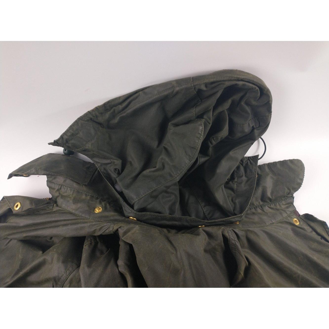 An XL approx sized TRADITIONAL GREEN WAXED BARBOUR Jacket with detachable hood ( in good condition)