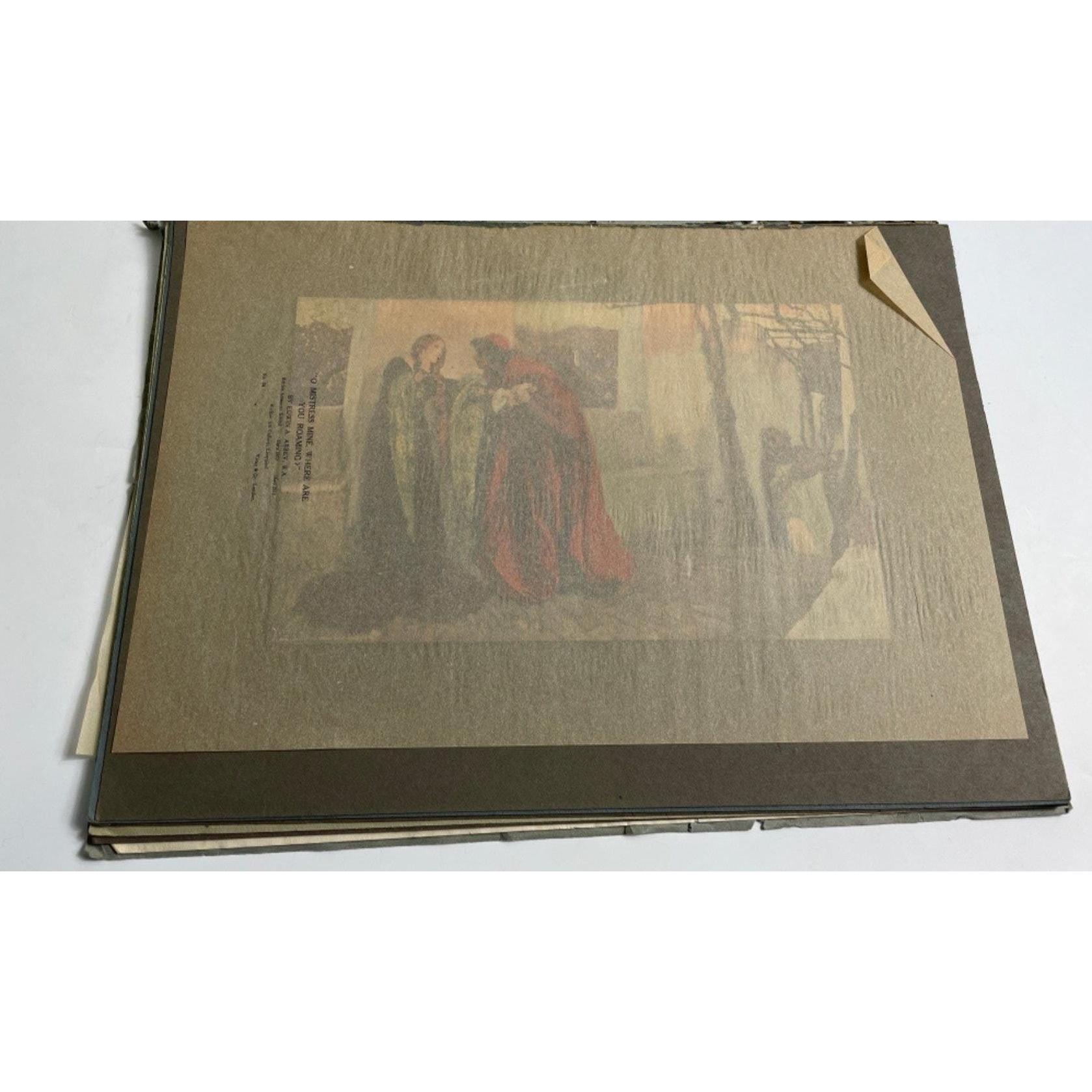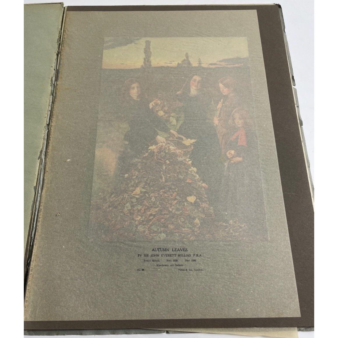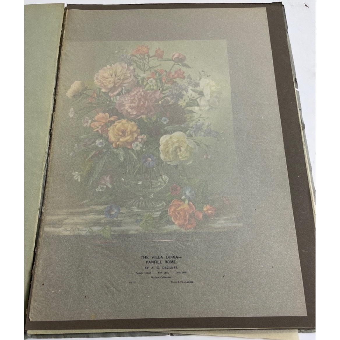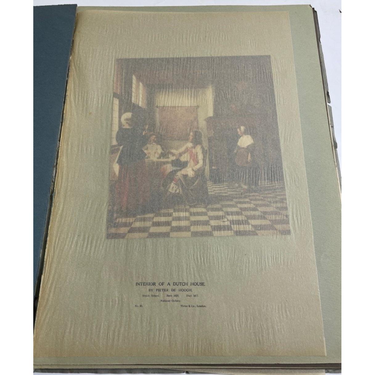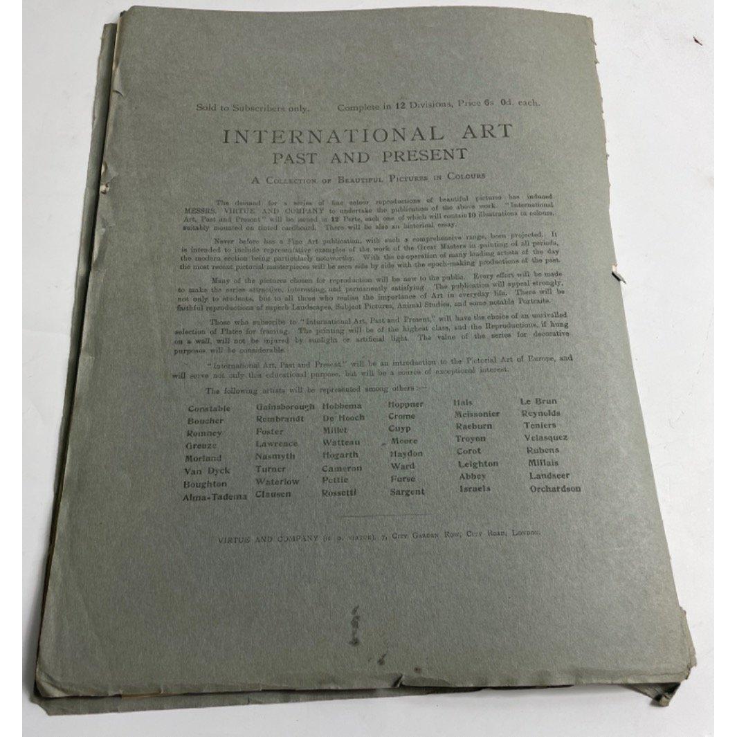 INTERNATIONAL ART PAST & PRESENT Div. 3 published in London by Virtue & Co. (1915) consists of 9 approx. 26 x 17cm colour plates reproducing paintings in Western art history protected by a captioned tissue card. Includes 'Oh mistress mine, where are you roaming?' by Edwin Abbey, 'The prayer' by Sassoferrato, 'Interior of a Dutch house' by Pieter de Hoogh, 'The Villa Doria - Panfili, Rome by AG Decamps, 'Spaniels of King Charles's Breed' by Edwin Landsser, 'Autumn Leaves' by John Everett Millais, An Old Dutch Waterway by Wilfrid Ball. Folio is in a fragile state but the prints are in good, unfaded condition.