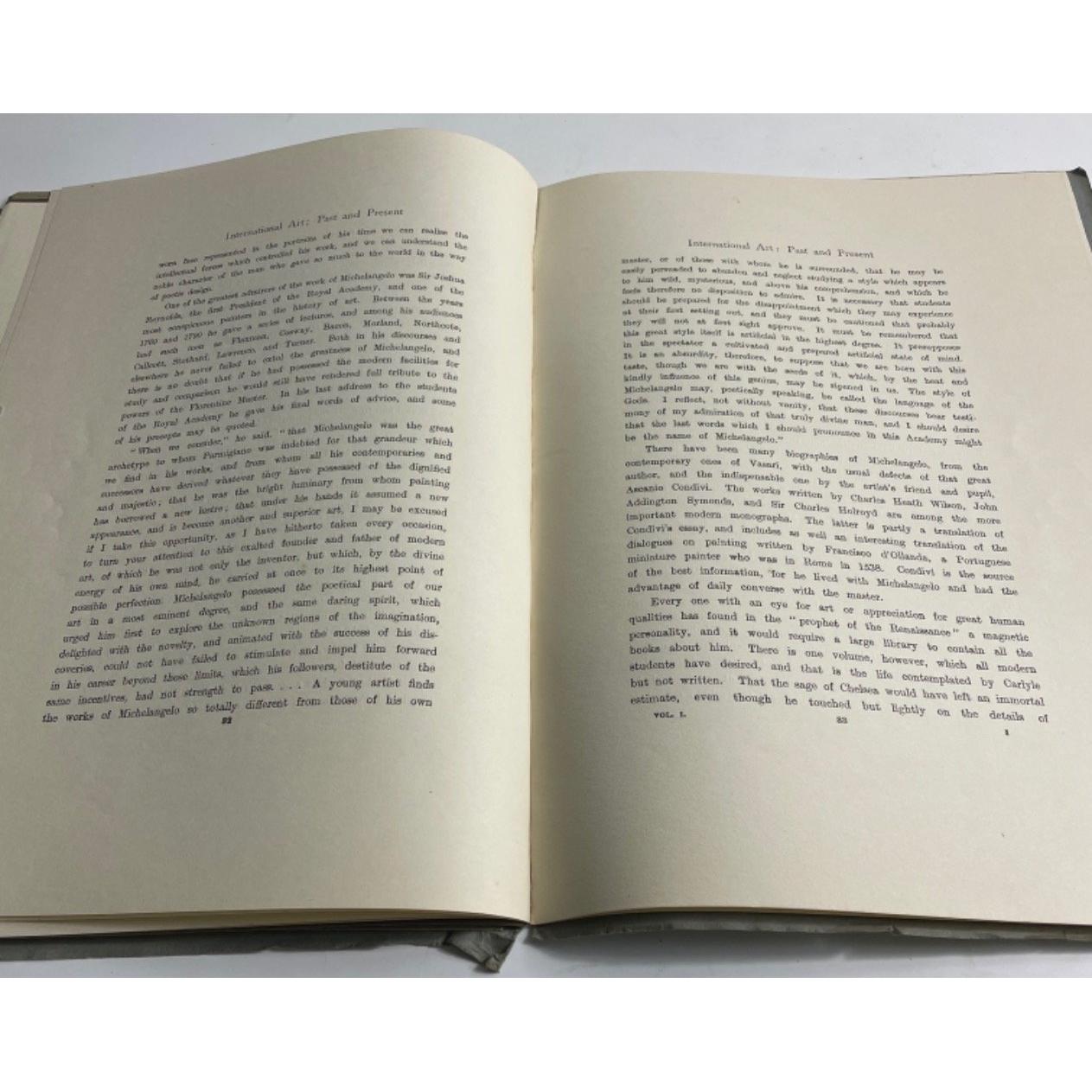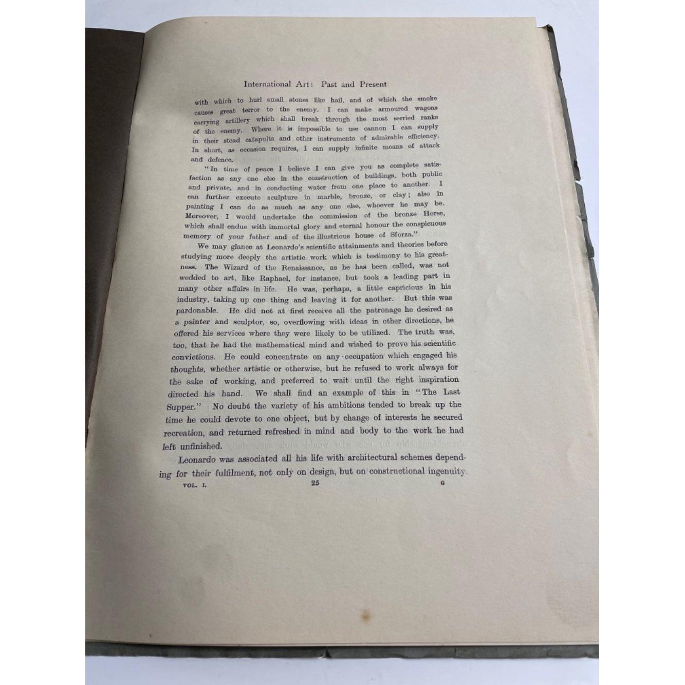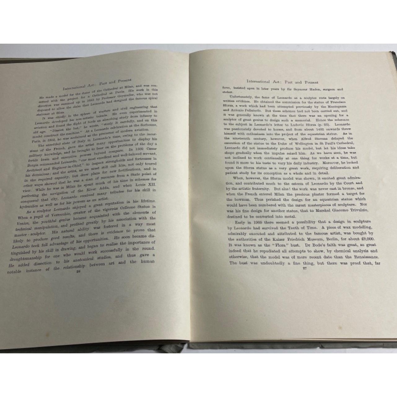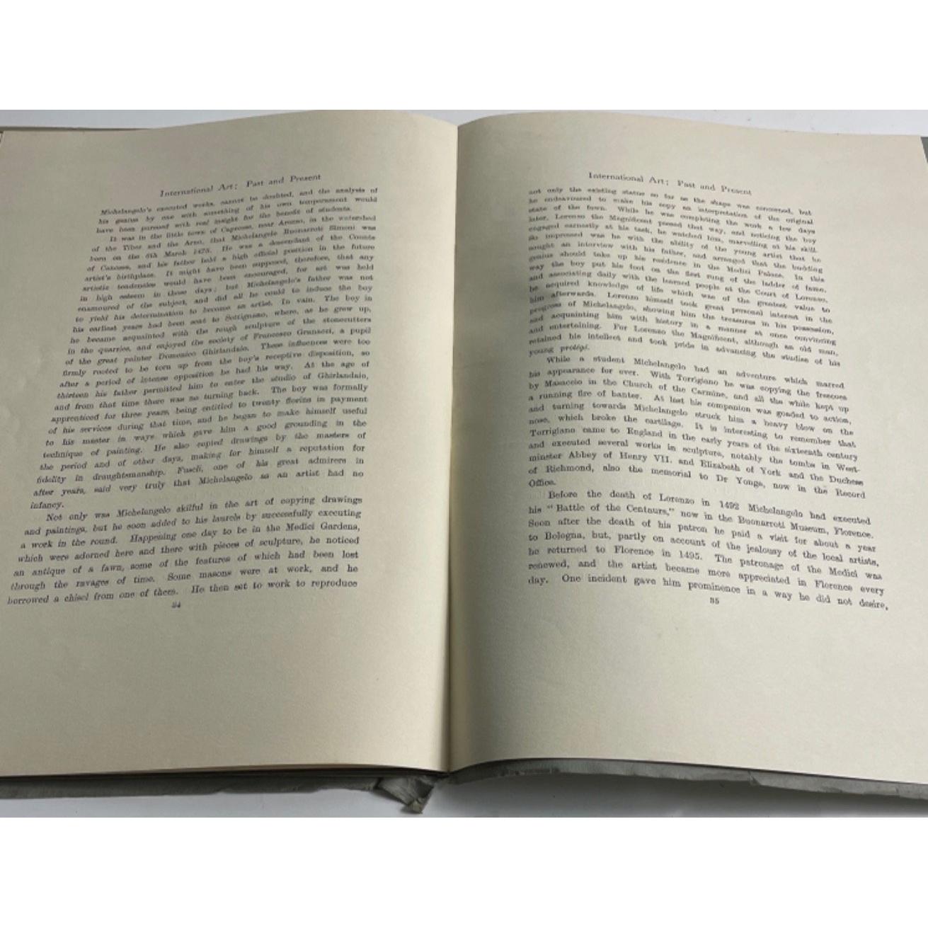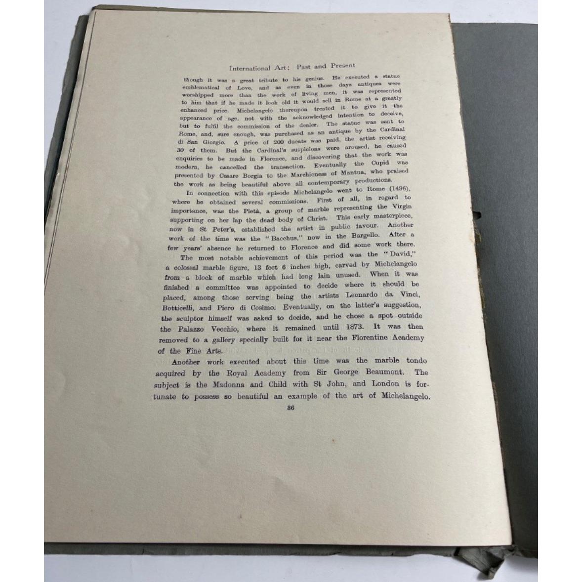 INTERNATIONAL ART PAST & PRESENT Div. 3 published in London by Virtue & Co. (1915) consists of 9 approx. 26 x 17cm colour plates reproducing paintings in Western art history protected by a captioned tissue card. Includes 'Oh mistress mine, where are you roaming?' by Edwin Abbey, 'The prayer' by Sassoferrato, 'Interior of a Dutch house' by Pieter de Hoogh, 'The Villa Doria - Panfili, Rome by AG Decamps, 'Spaniels of King Charles's Breed' by Edwin Landsser, 'Autumn Leaves' by John Everett Millais, An Old Dutch Waterway by Wilfrid Ball. Folio is in a fragile state but the prints are in good, unfaded condition.