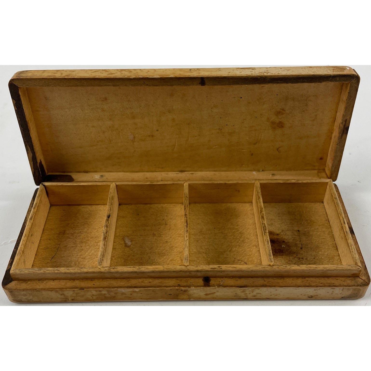 A VINTAGE c1910 small wooden lidded box marked with hand painted ‘ STAMPS' on the lid - beautiful PATINA! With 4 small compartments...L: 11.5cm approx W: 4.5cm approx