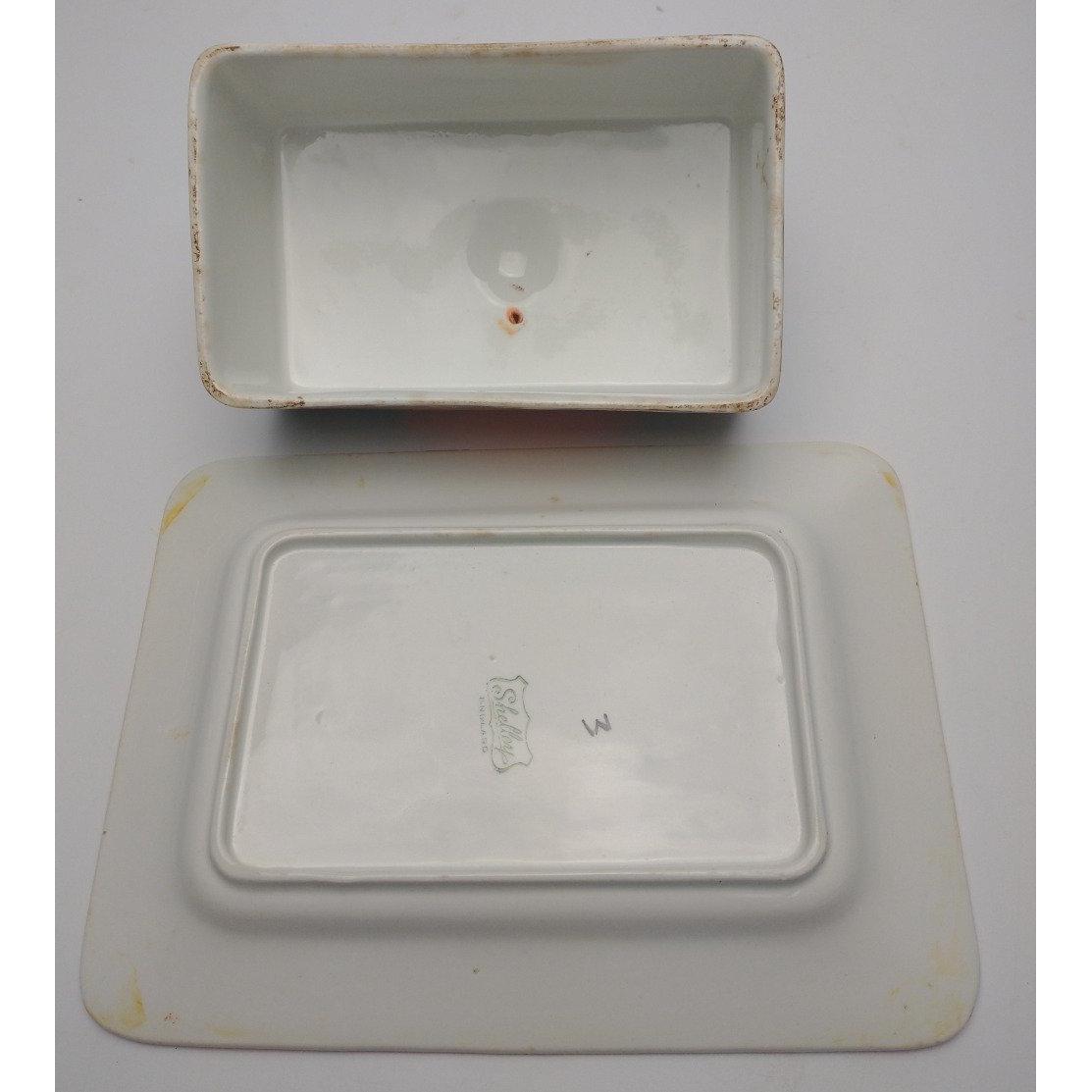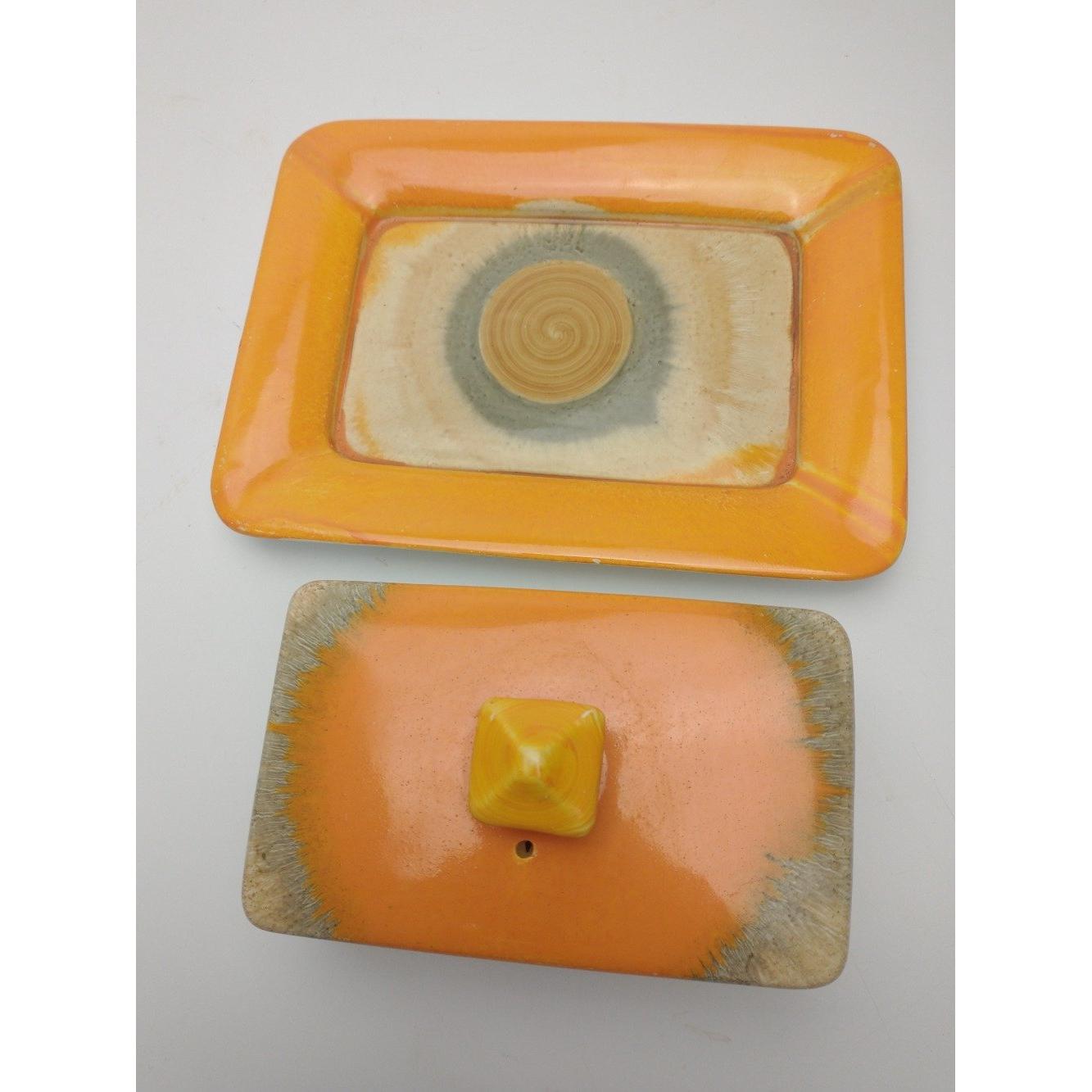 VIBRANT SHELLEY butter dish with volcanic orange and stone colouring. Has a swirling vortex style pattern on the base of the dish. Possibly part of the Harmony collection which was started in 1932 by Eric Slater. The glazing process creates random patterns leading to unique pieces