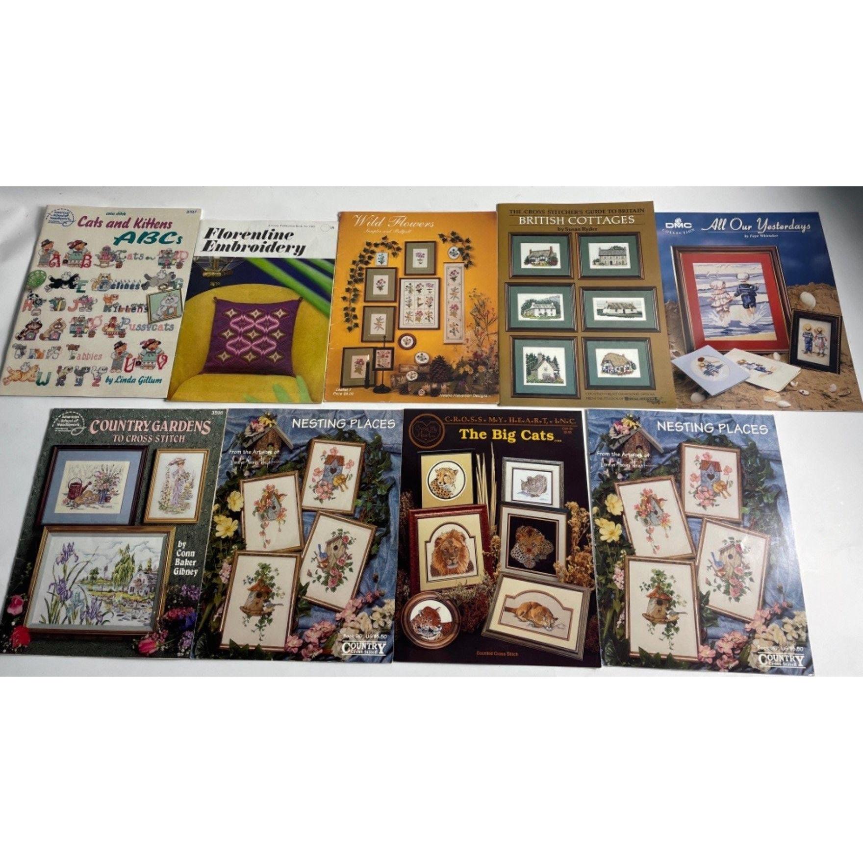 Collection of CROSS STITCH CHARTS to include cats of all sizes, historical buildings, flowers, alphabets, etc. Patterns by DMC, Cross My Heart, American School of Needlework etc.