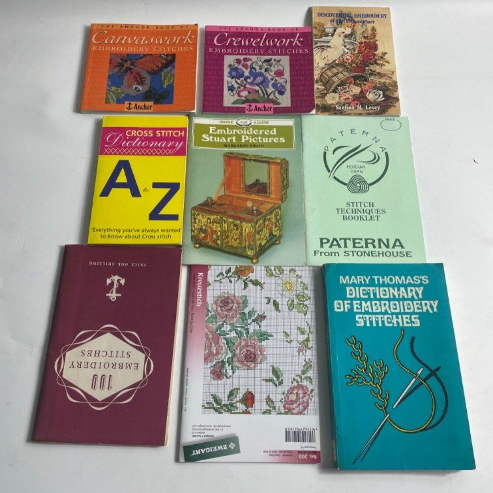 Cross stitch pattern books to include EXQUISITE MINIATURES IN CROSS STITCH by Brenda Keyes, FLORAL CROSS STITCH by Eleonore Gross-Ekowski, THE ULTIMATE CROSS STITCH COMPANION by Dorothy Wood, HOLIDAY MEMORIES IN CROSS STITCH AND NEEDLEPOINT by Chris Timms, THE ART OF WILLIAM MORRIS IN CROSS STITCH by Barbara Hammet, COUNTRY CROSS STITCH by Gail Bussi et al, CROSS STITCH A BEAUTIFUL GIFT by Sharon Perna, COUNTED THREAD EMBROIDERY by Jean Kinmond. All in excellent condition.