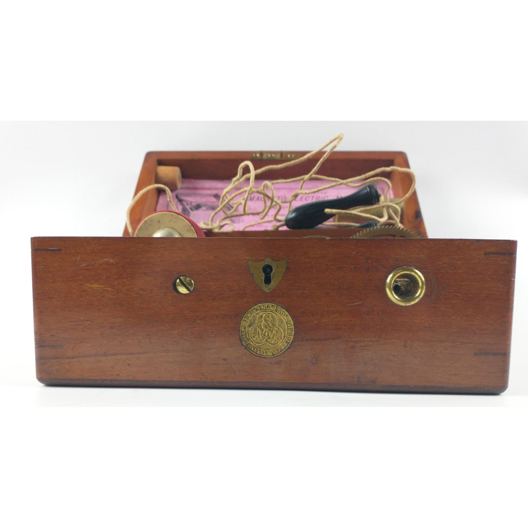 RARE! The Improved Magneto-Electric machine for Nervous diseases by S.Maw son & Thomson, in wooden case. Have a shocking time with it!W: 26cm approx H: 11.5cm approx D: 14cm approx