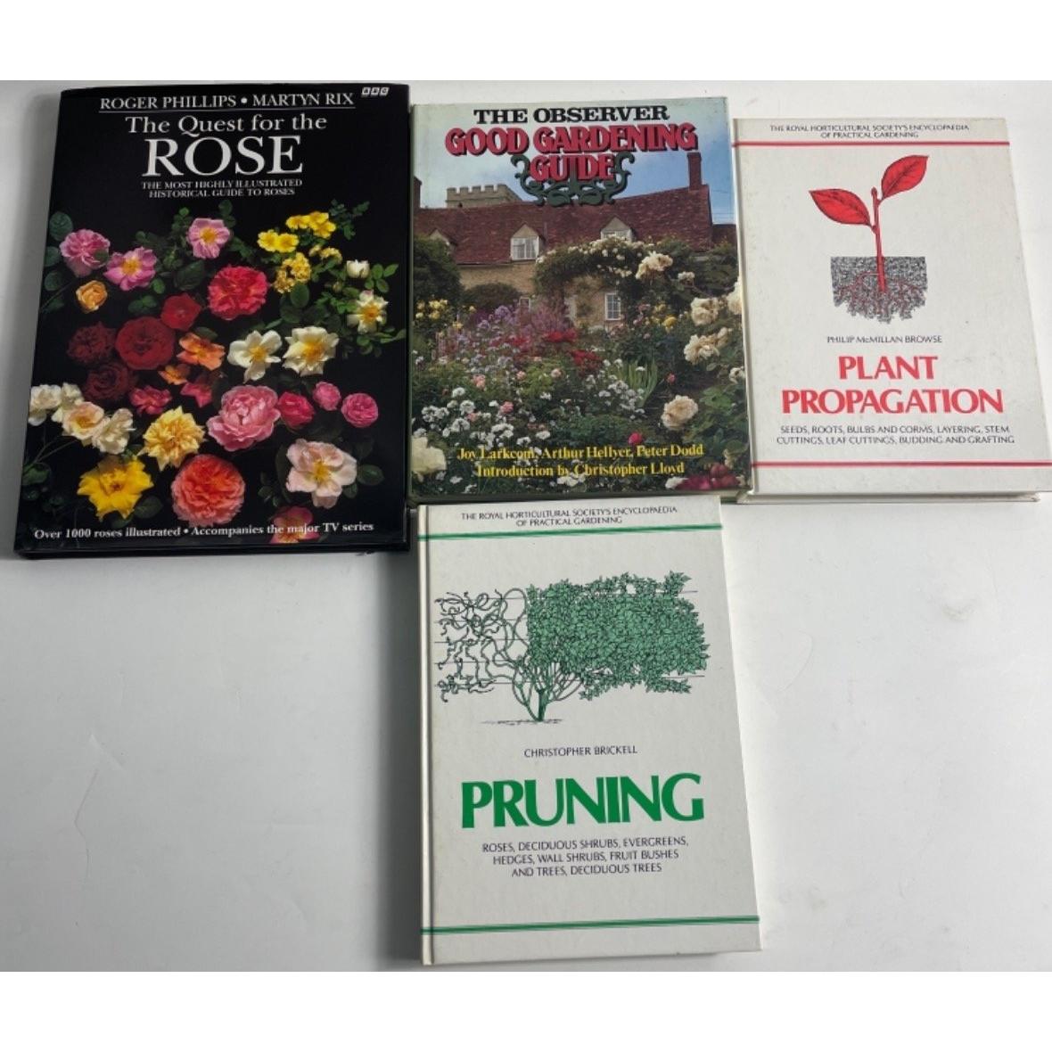 Floral gardening books to include THE QUEST FOR THE ROSE by Roger Phillips, GARDENER'S GUIDE TO GROWING ROSES by John Mattock, PRUNING by Christopher Brickell, PLANT PROPAGATION by Philip McMillan Browse, FLORAL BRITANNICA by Richard Mabey, THE COMPLETE LANGUAGE OF FLOWERS by Sheila Pickles, SOME FLOWERS by Vita Sackville-West,THE CONCISE BRITISH FLORA IN COLOUR by W. Keble Martin, COLOUR GARDEN by Malcolm Hillier, FOLIAGE FOR YEAR ROUND COLOUR by Jane Taylor. All in excellent condition.