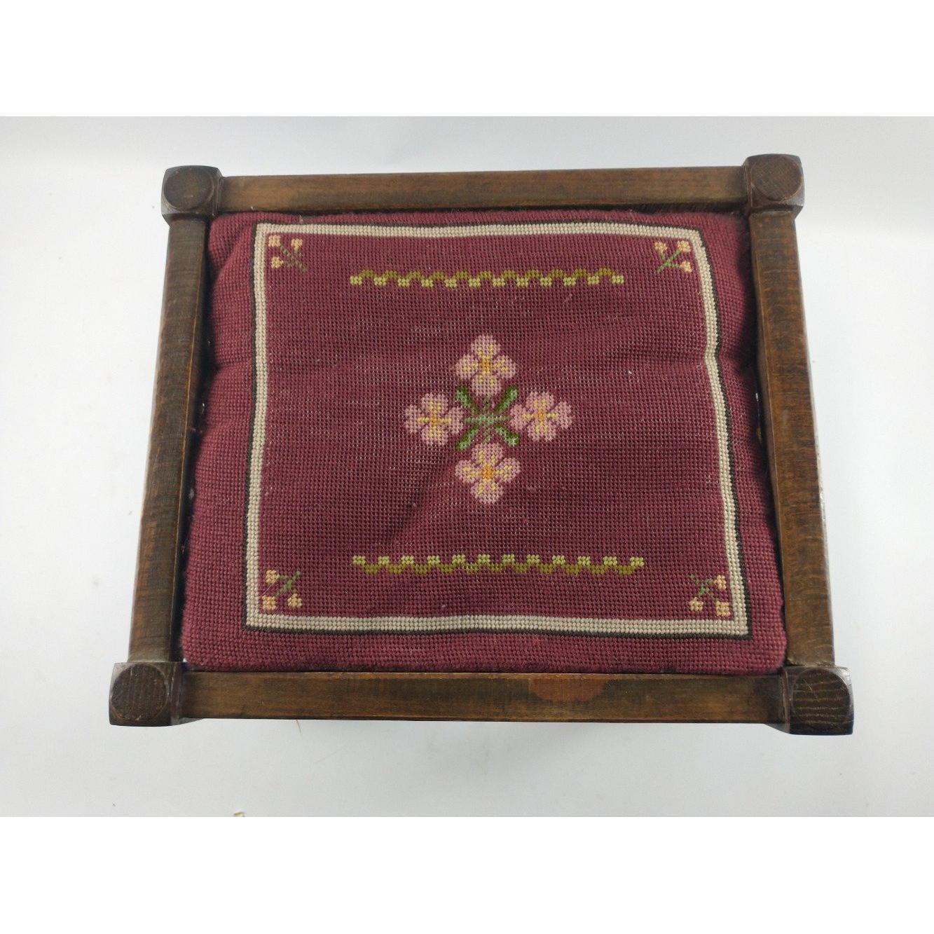 Tapestry topped footstool with stretchered legsL: 40cm approx W: 34cm approx H: 28cm approx