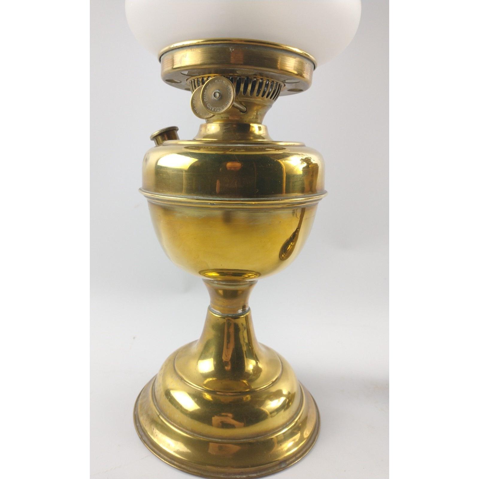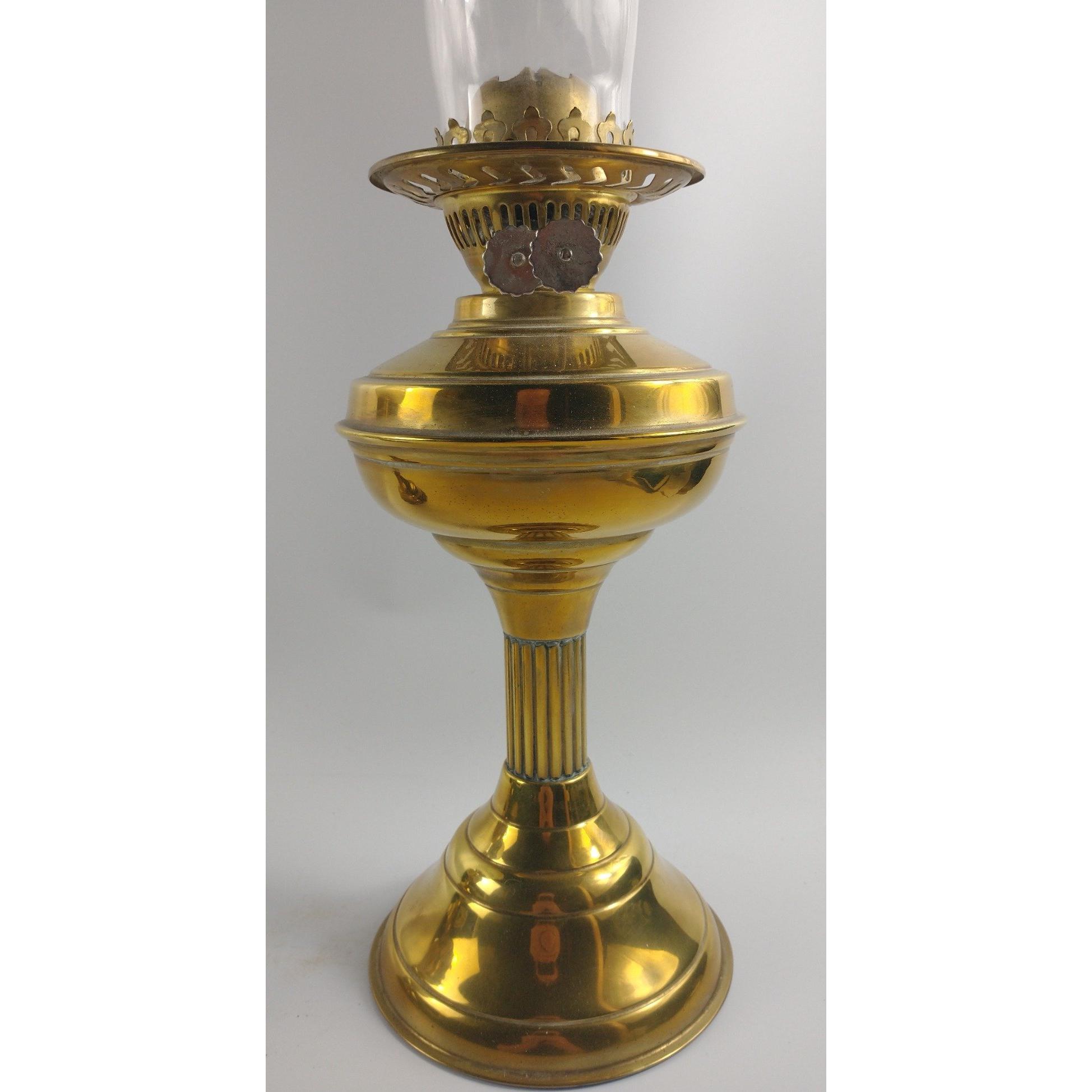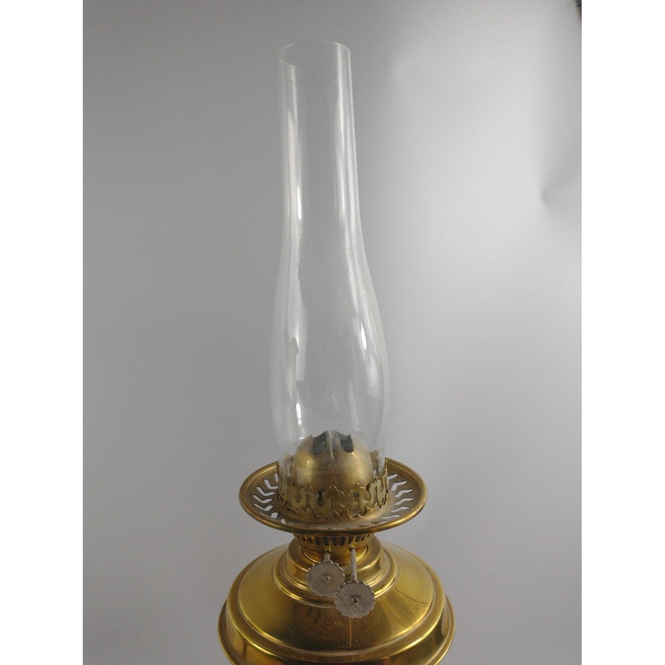 Two brass-effect oil lamps, one with shade both with chimneys approx. 50cm each.Approx 2 pieces