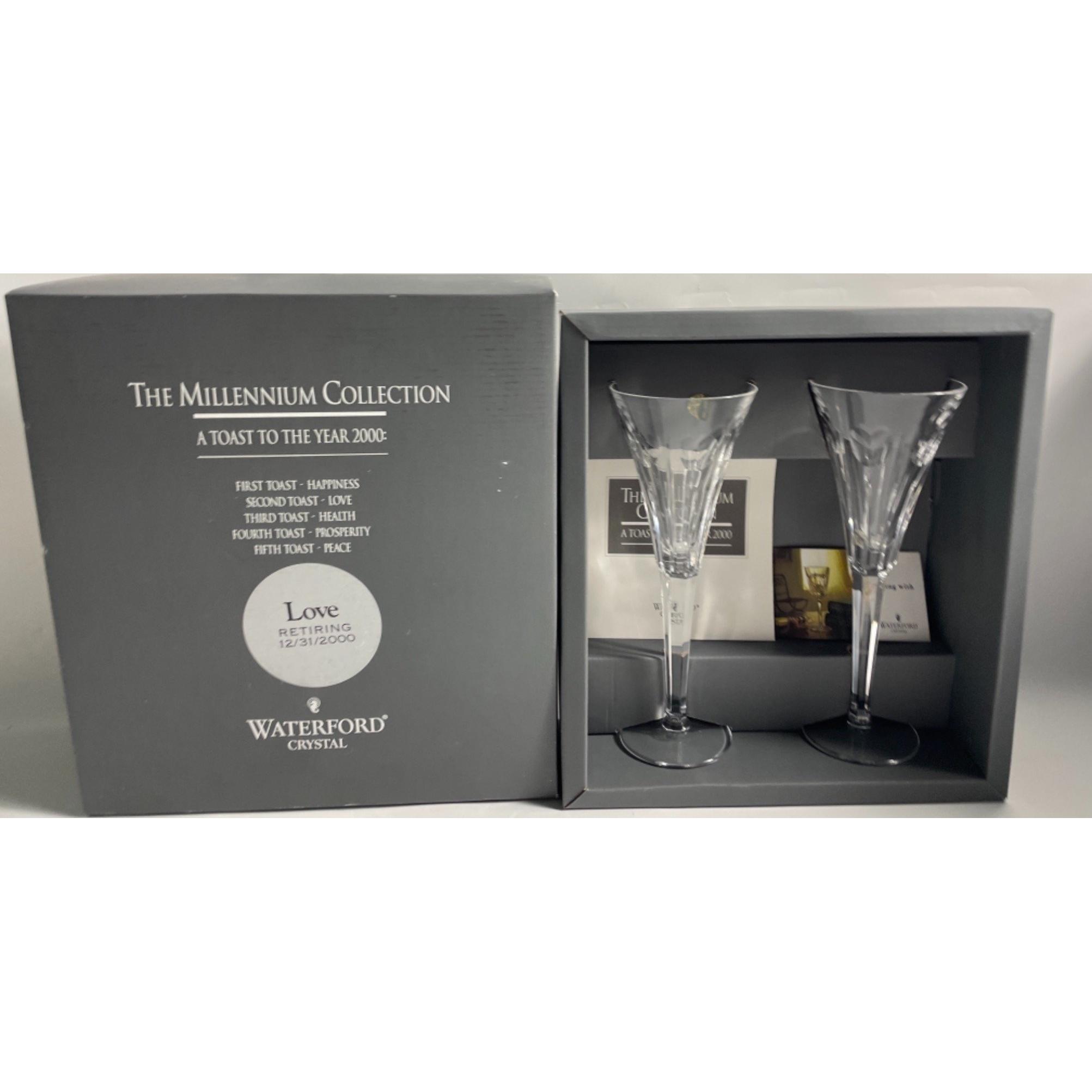 WATERFORD CRYSTAL THE MILLENNIUM COLLECTION TWO LARGE CHAMPAGNE FLUTES in original gifting box. Engraved with just hearts on both glasses. Label to side says 'Love'Approx 2 pieces