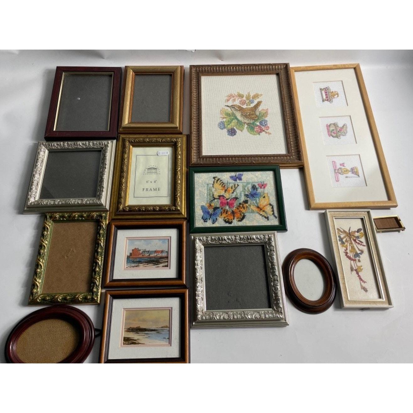 Box of mixed frames in various sizes also including some handcrafted pictures.
