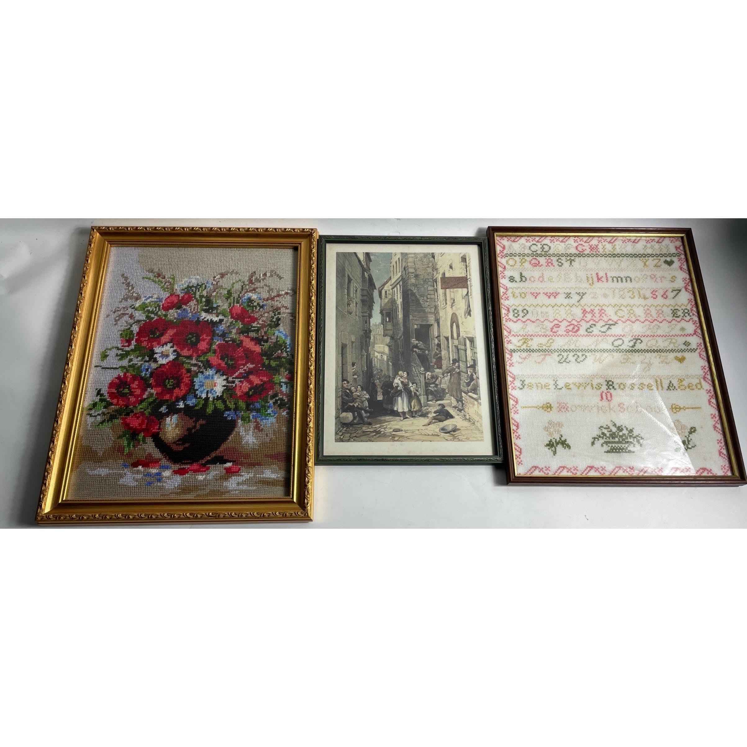 Mixed box of pictures mainly hand-worked tapestries in various subjects worked by an expert.