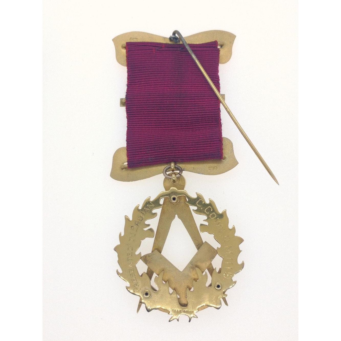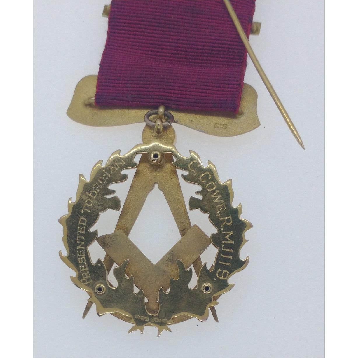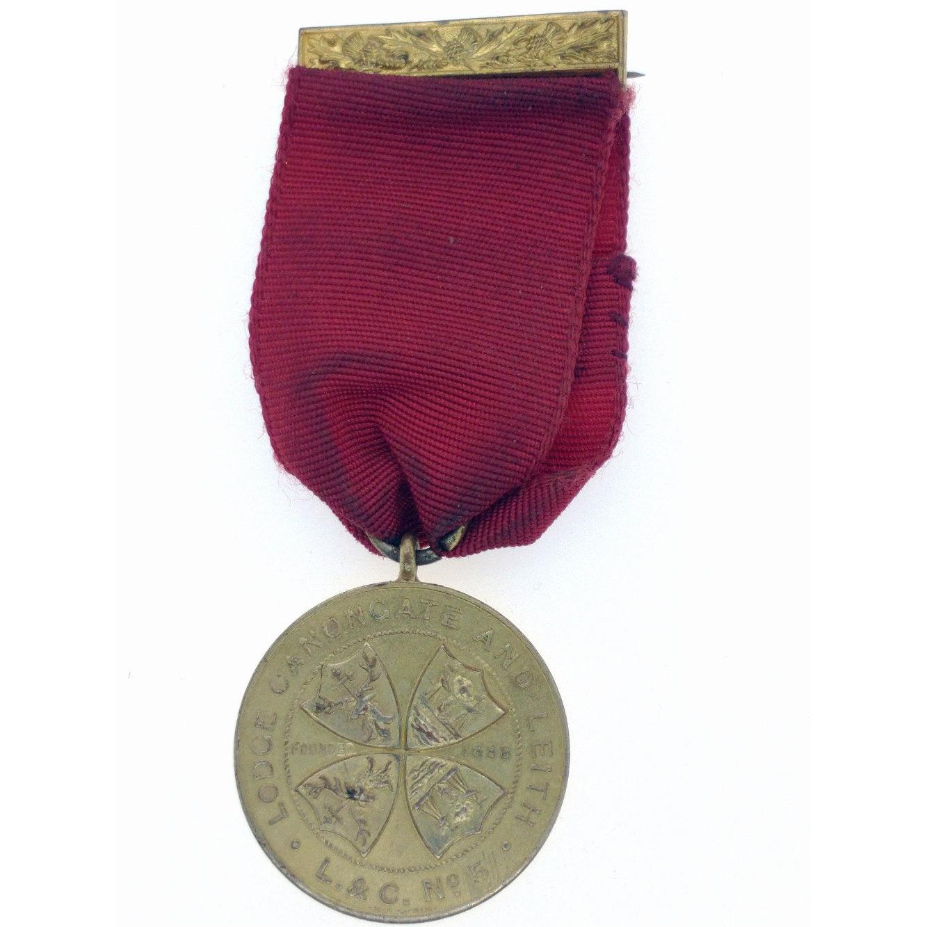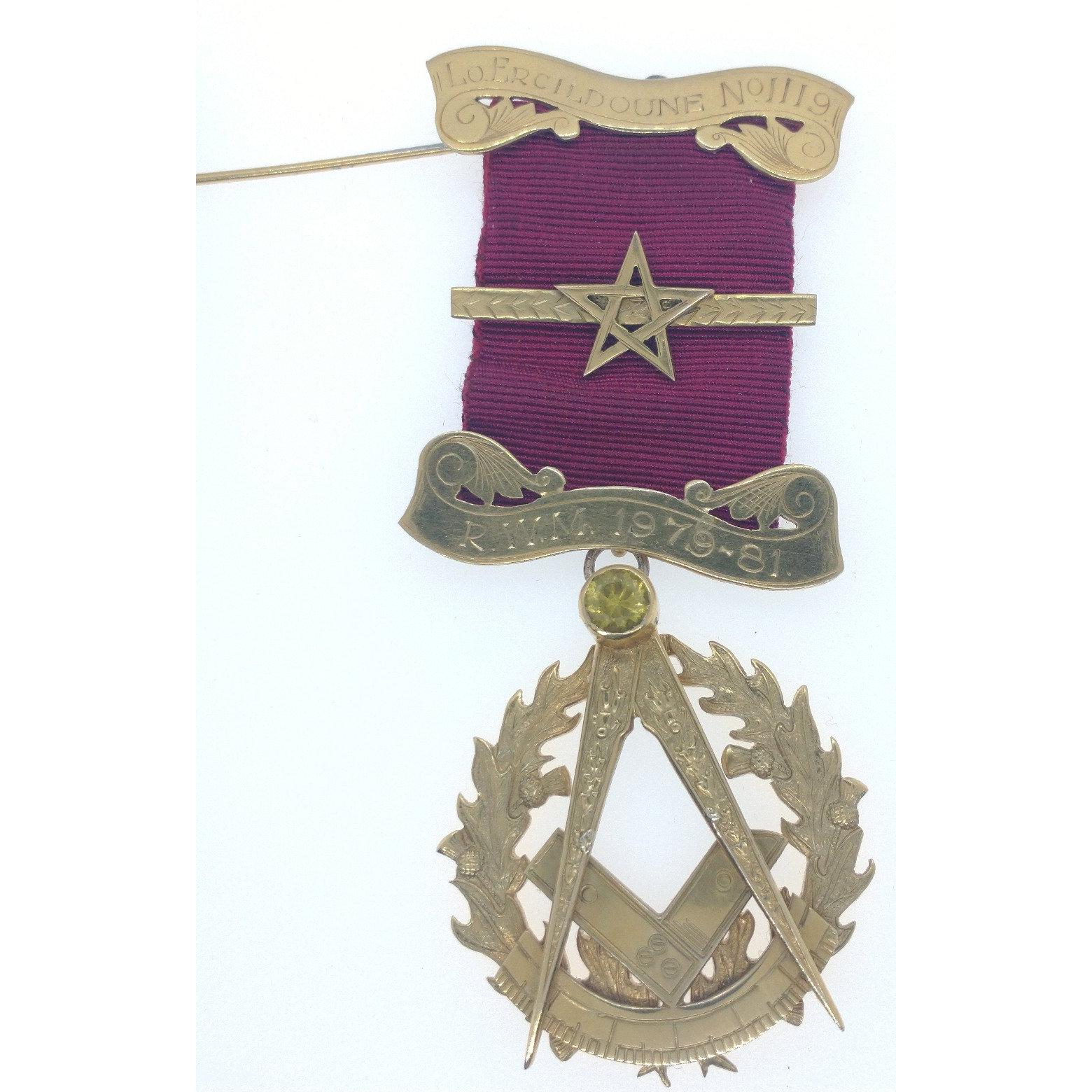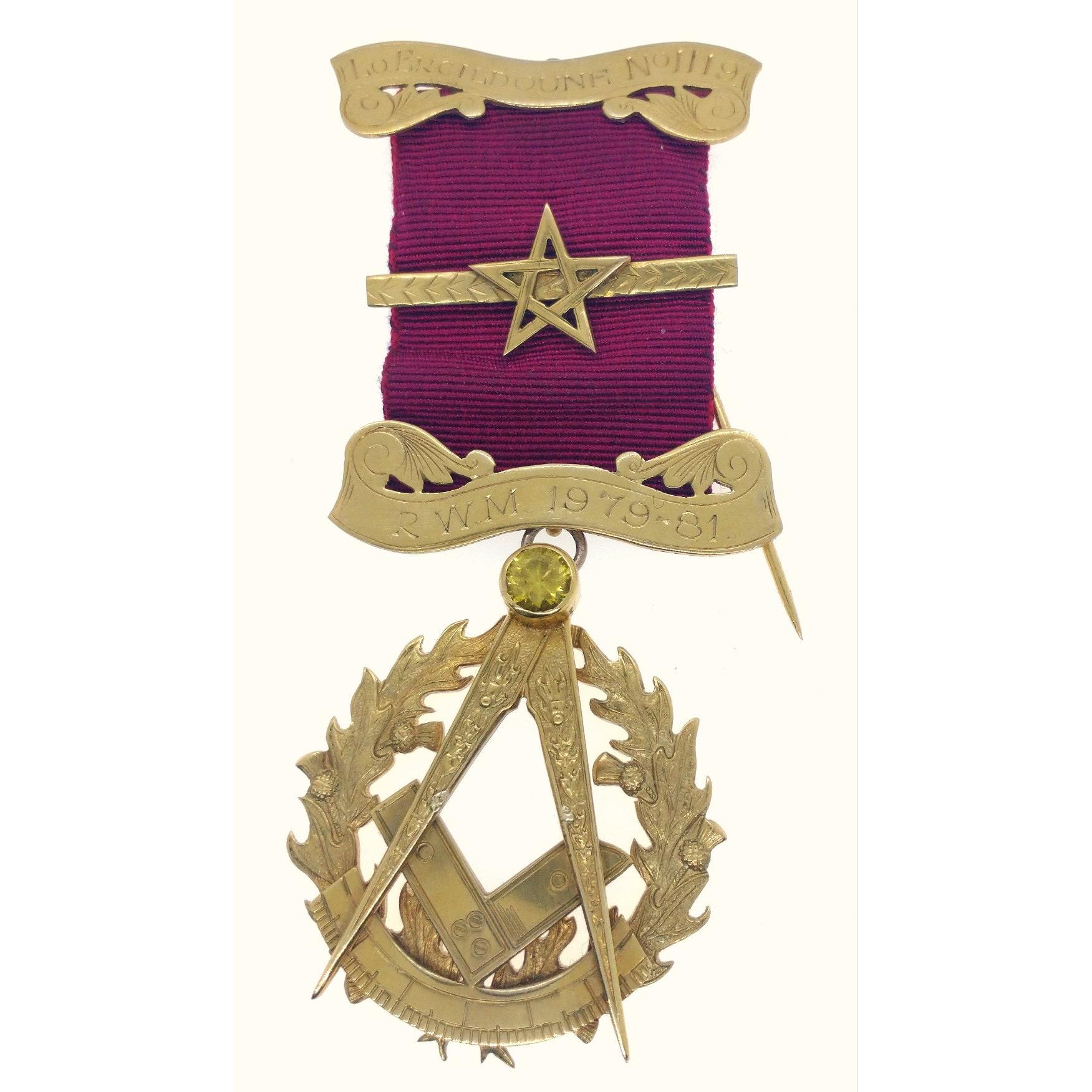 MASONIC LOCAL INTEREST EARLSTON (Lo.ERCILDOUNE LODGE NO 1119) SOLID 375 STAMPED YELLOW GOLD stamped Freemasons Crest Masonic Square & Compass Lapel Member large pin badge with a citrine style stone centred on the compass hinge. Weight gross including the stone and the ribbon 27.64g with a Cannongate & Leith Lodge No 5 medallion in yellow metal with ribbon