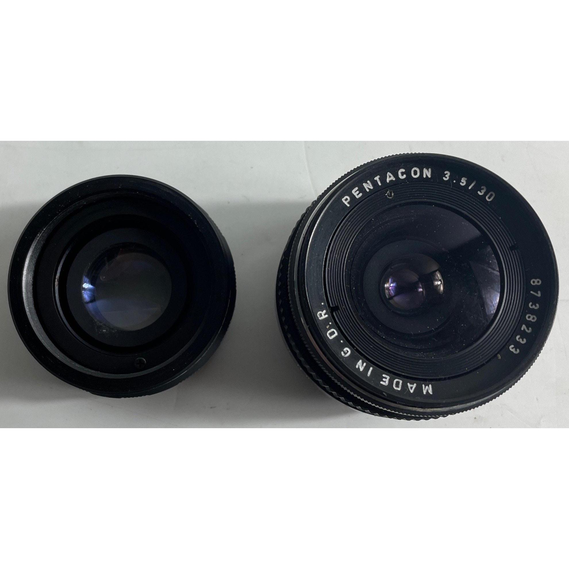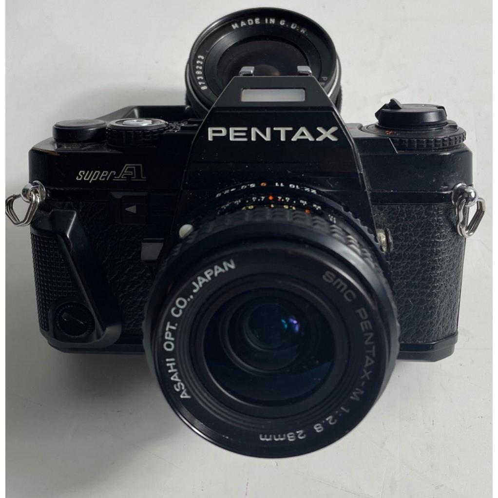 Collection of camera equipment to include PENTAX MZ-50 film camera with PENTAX 35-80 1:4-5.6 lens and manual, PENTAX Super A film camera with PENTAX-M 1:2.8 28mm ASAHI OPT.CO, Japan lens, CIMKO Auto 2X TELE convertor, HANIMEX AUTOMATIC ZOOM C-MACRO F=80-200mm 52ΓΈ No 215540 and a PENTACON 3.5/30 lens in leather pouch and spare padded lens holder