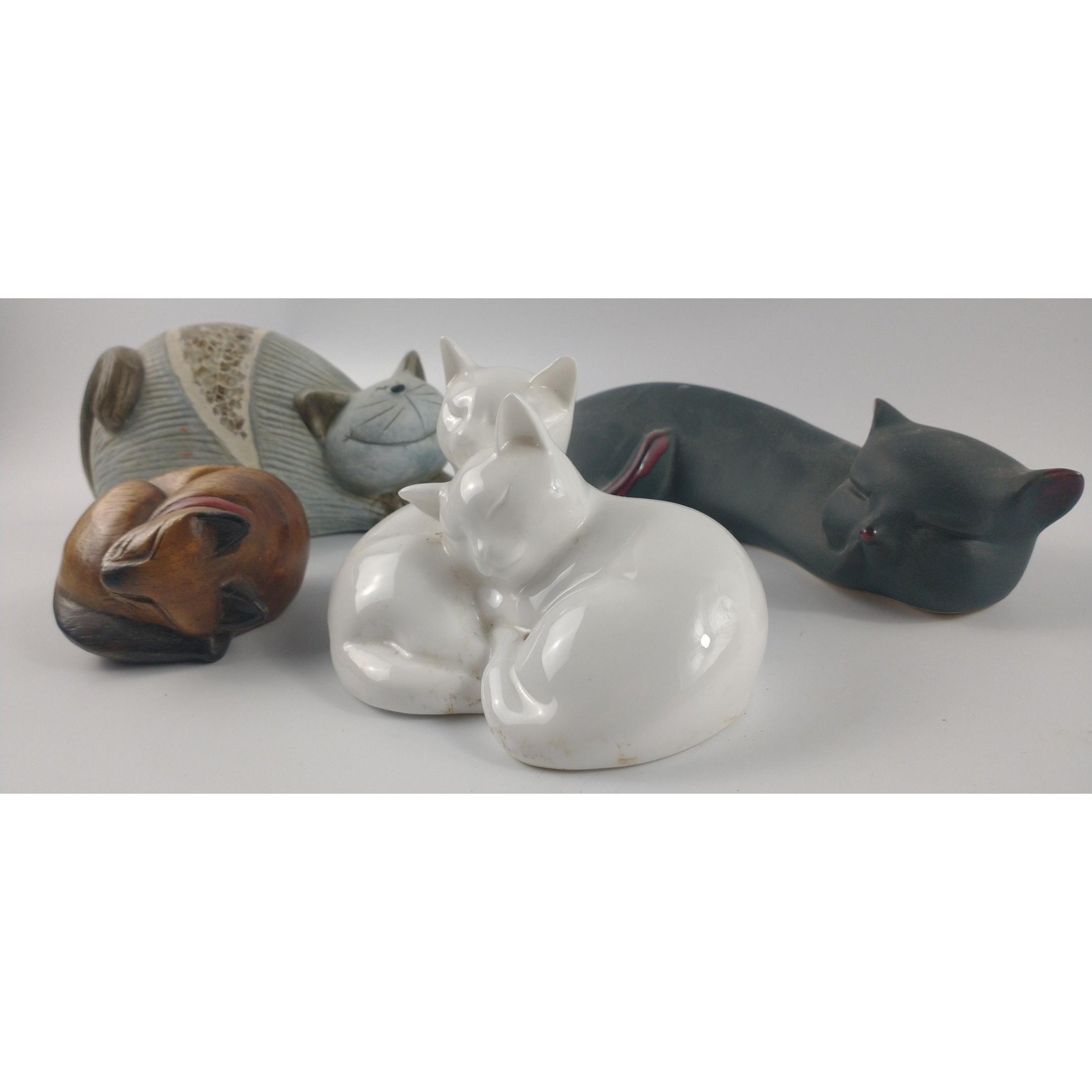 The cat collection - a pair of ROYAL DOULTON 'Sleepy Heads', a smiling terracotta cat (16cm approx), a sleeping black cat (22cm approx) and a small carved wooden cat having a snooze.Approx 4 pieces