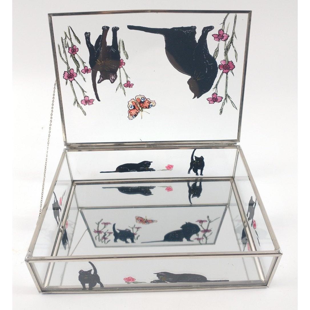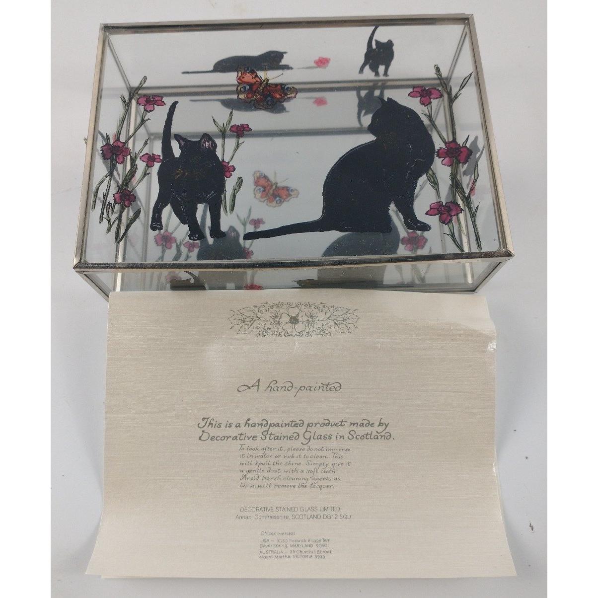 Very pretty hand-painted glass trinket box with design of cats , made in Annan, Scotland