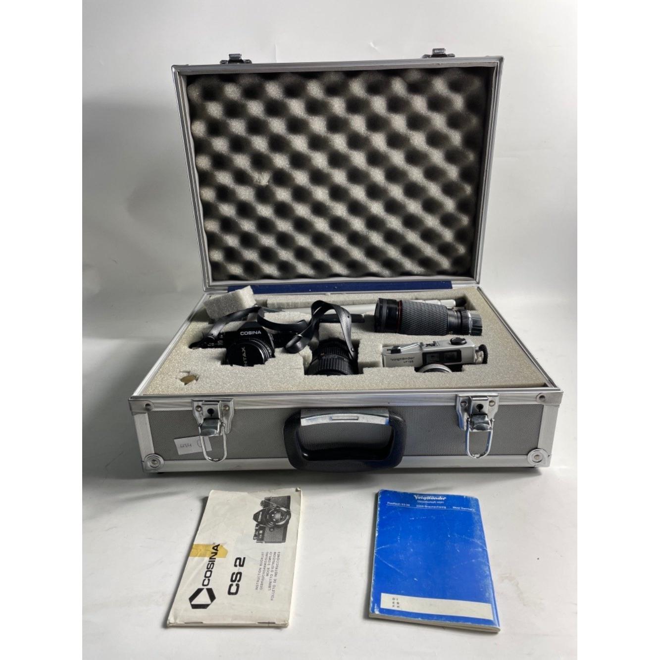 A photographic aluminium style case with VOIGGLANDER VF 135 camera, a PENTAX CS-2 COSINA camera PYRAMID P250 branded tripod, also a HOYA 62mm MACRO lens, and a HOUA 62mm SKYLIGHT lens