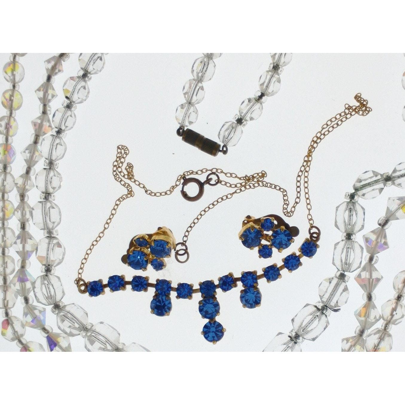 A nice set of 3 VERY VINTAGE (just for you Rob) crystal style necklaces and a separate wee blue stone style set necklace in yellow metal with a pair of matching earrings 'thrown in' to!Approx 3 pieces