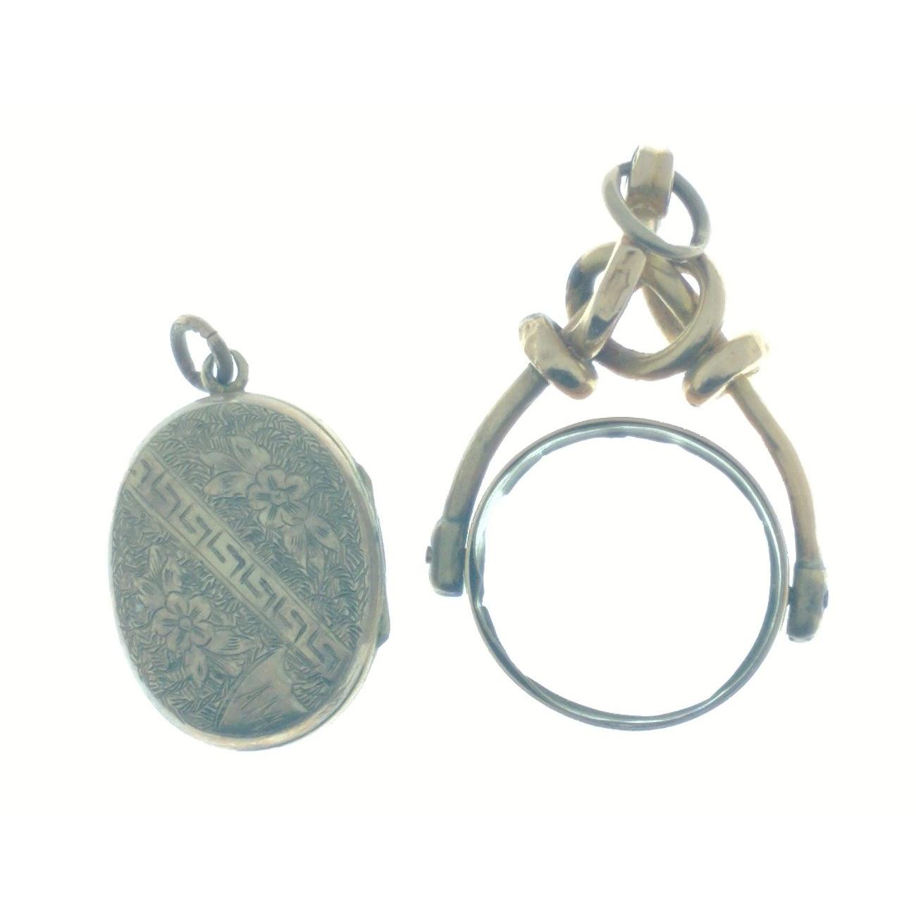A Victorian 'yellow metal' fob charm with missing stone weight 5.29g approx, a VINTAGE 'yellow metal' photo pendant with blue enamel style and seed pearls inset weight gross 6.15g approx. Both acid test to 12ct
