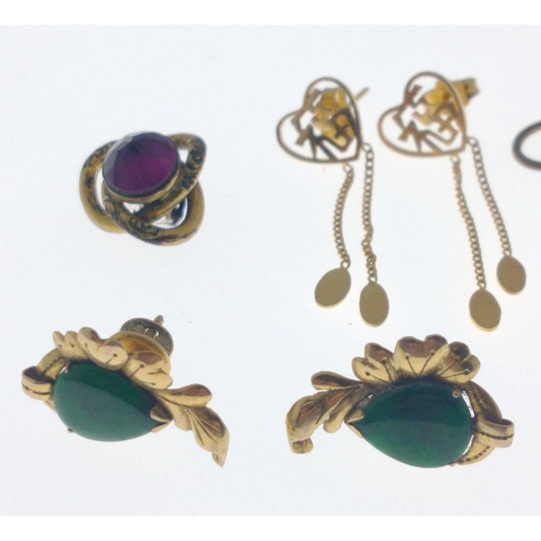 A TASTE OF THE ORIENT!! A 14K stamped yellow gold pair of earrings with green stones inset weight 2.40g gross approx, also a pair of unstamped 'yellow metal' Oriental design stud earrings in love heart form weight 1.45g, with an ORIENTAL part of an earring in 'yellow metal' weight .19g approx, and also another miniature pair of ORIENTAL 'yellow metal' stud earrings weight .66g approx and a part-pin missing brooch head with pinkish stone inset in 'yellow metal' weight gross 2.17g approx and lastly a pair of VINTAGE SILVER stamped pearl earrings gross weight 2.28g approx