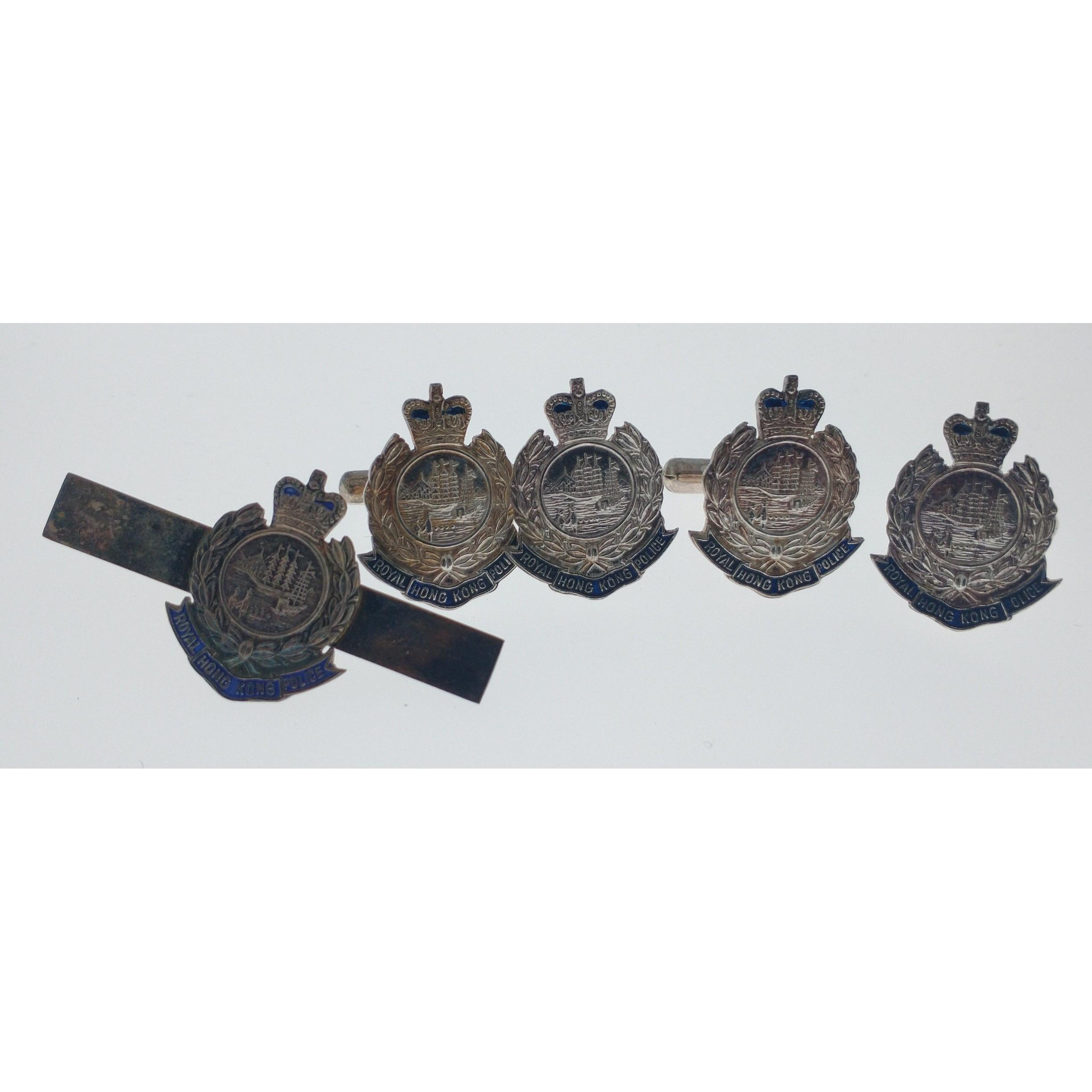 VINTAGE ROYAL HONG KONG POLICE cufflinks and tie-clip STERLING stamped with also a pair of yellow metal ROYAL Hong Kong police cufflinks (family lived and worked in Hong Kong most of their lives!)