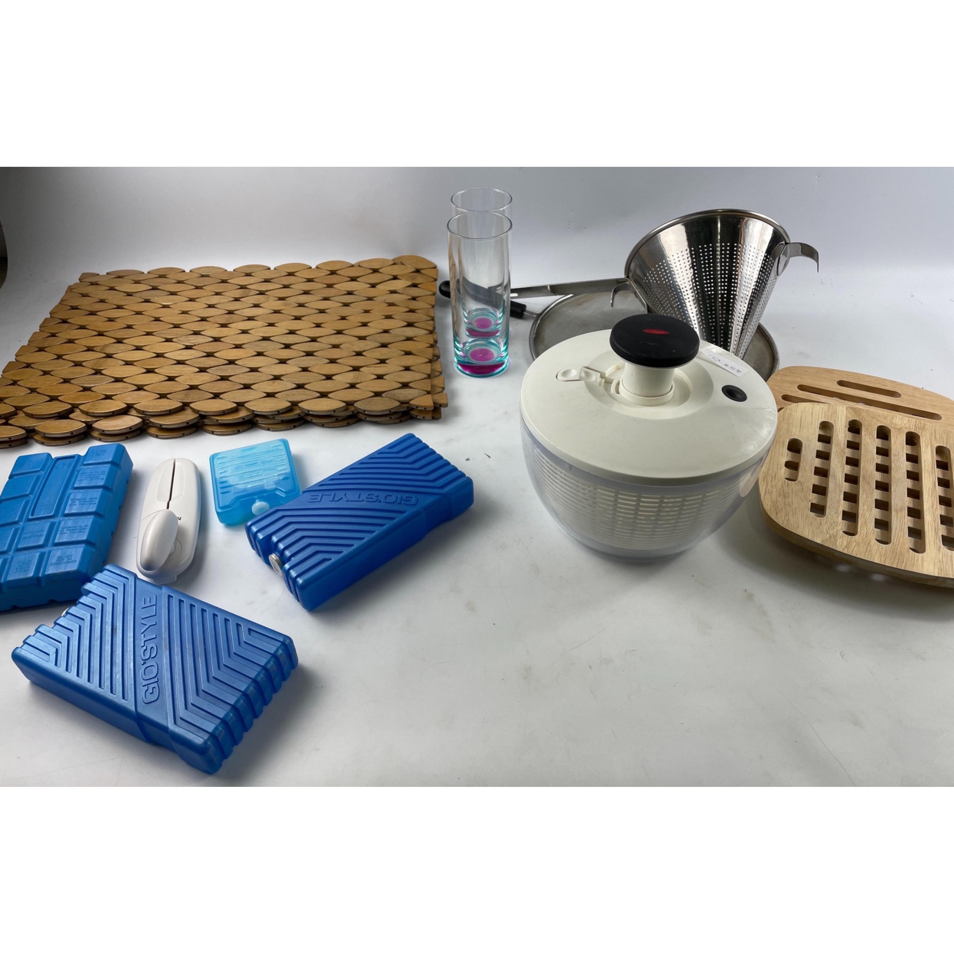 MIXED KITCHEN box to include new saucepan splashguard, cone stainer, mats, salad spinner etc.