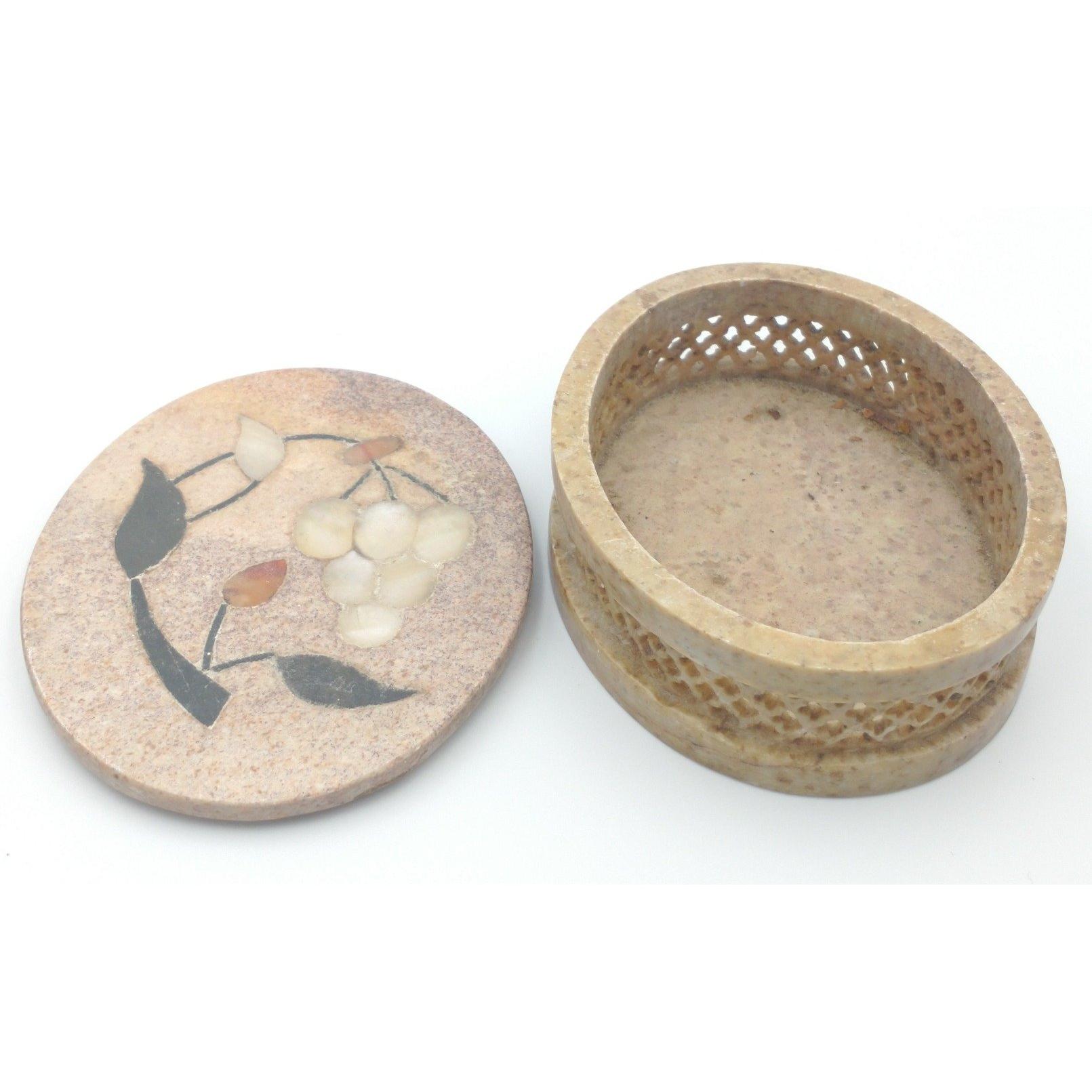LOVELY QUALITY! A nice wee SOAPSTONE style trinket dish with pierced design and with a floral pattern on the lidL: 10cm approx H: 3cm approx