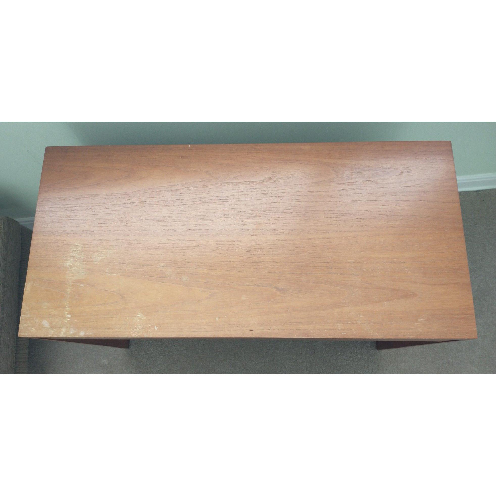 A WILLIAM LAWRENCE 1970's retro teak desk/ dressing table - the surface may require a little tlc but otherwise a SOLID piece of nice firniture!L: 92cm approx H: 66cm approx D: 44cm approx