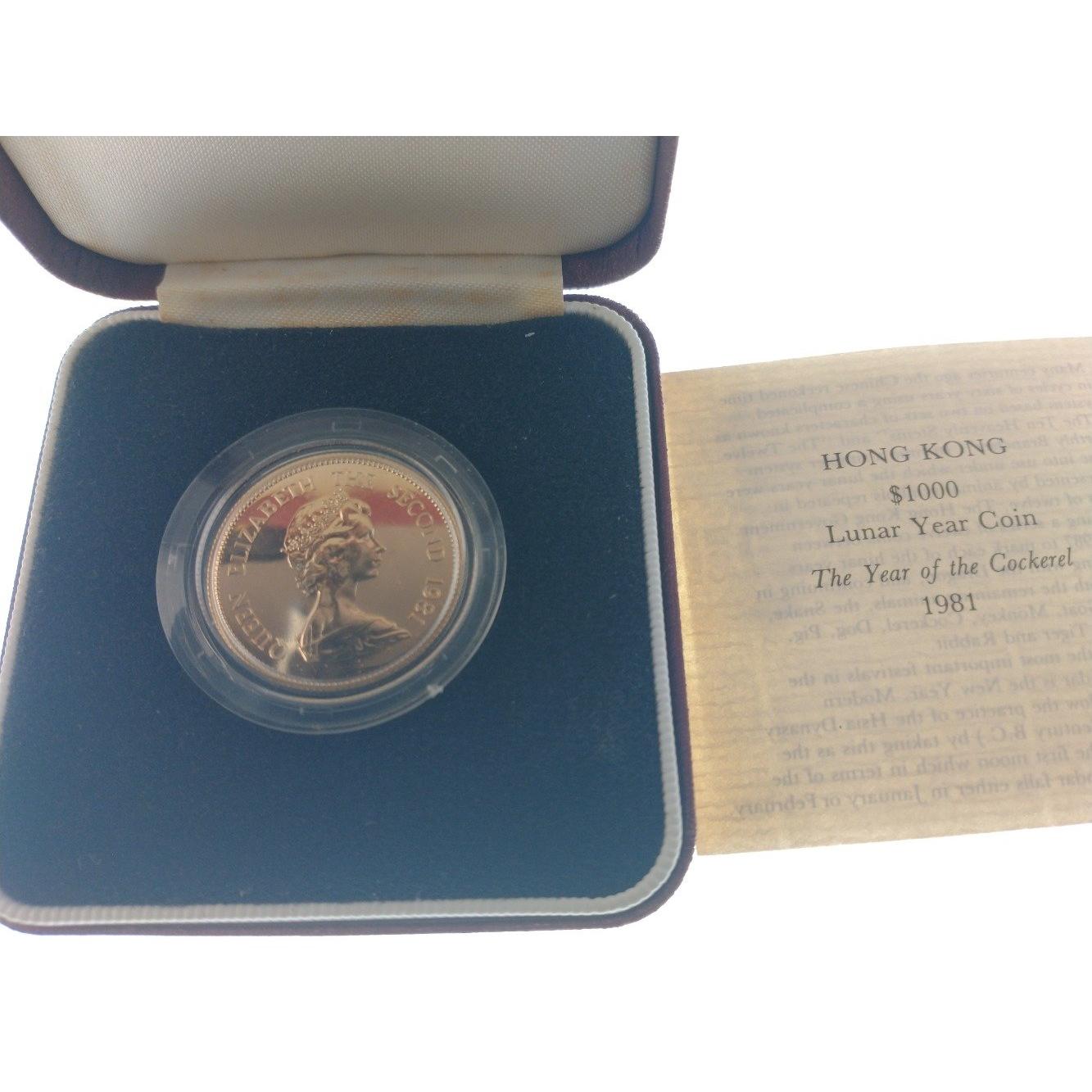 A 1981 HONG KONG $1000 Lunar Year Coin 'The Year Of The Cockerel' struck in 22ct yellow gold within its protective case In 1981 to celebrate the Lunar Year of the Cockerel, the Royal Mint released a very Limited Issue Lunar Cockerel $1000 One Thousand Dollar Gold Proof ...weight 15.98g - comes in original presentation case