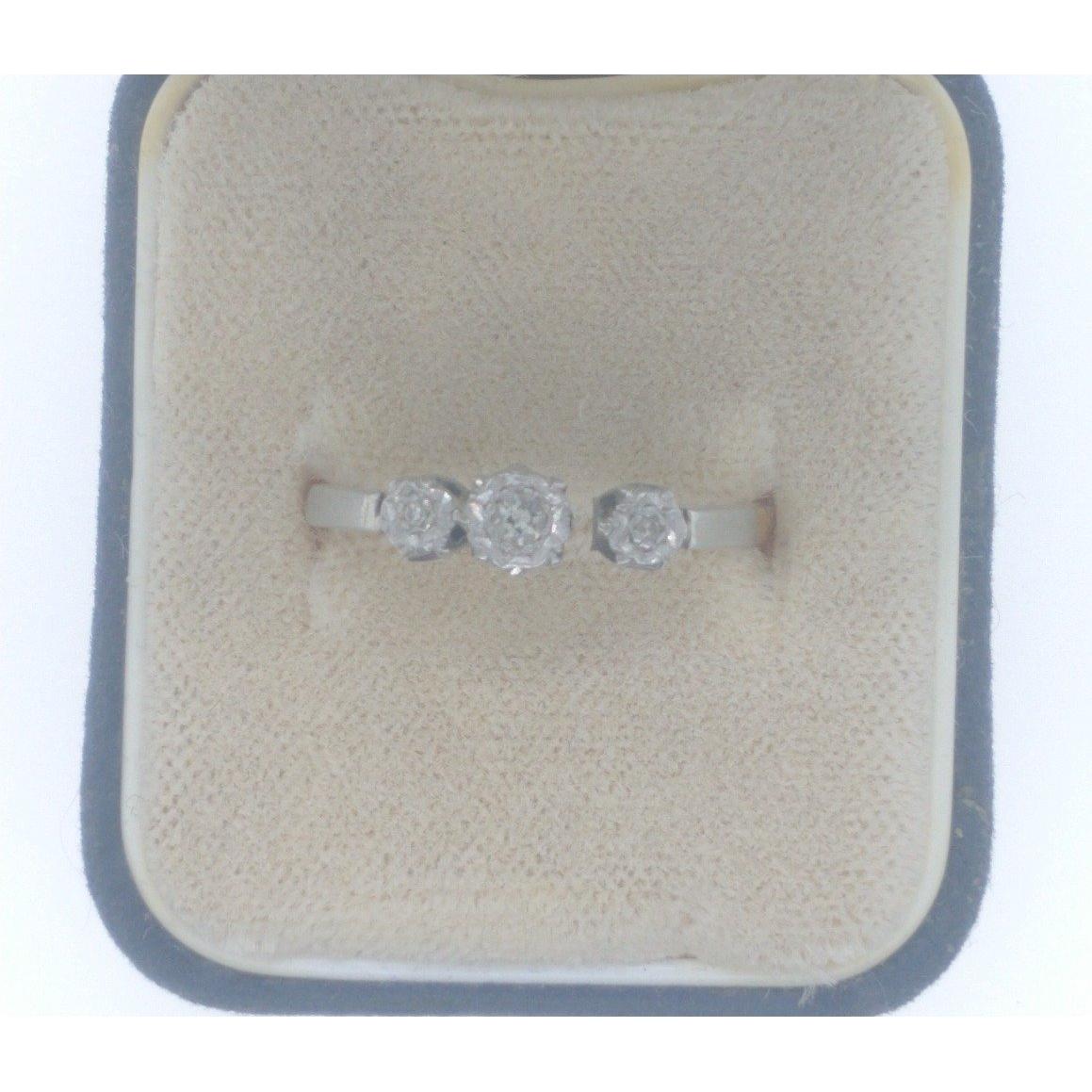 An 18ct stamped yellow gold engagement ring, set in platinum with three diamonds inset, the middle diamond is the larger flanked with two smaller diamonds (Diamonds tested) Ring size L (Point to note the ring requires a small repair to join the setting)