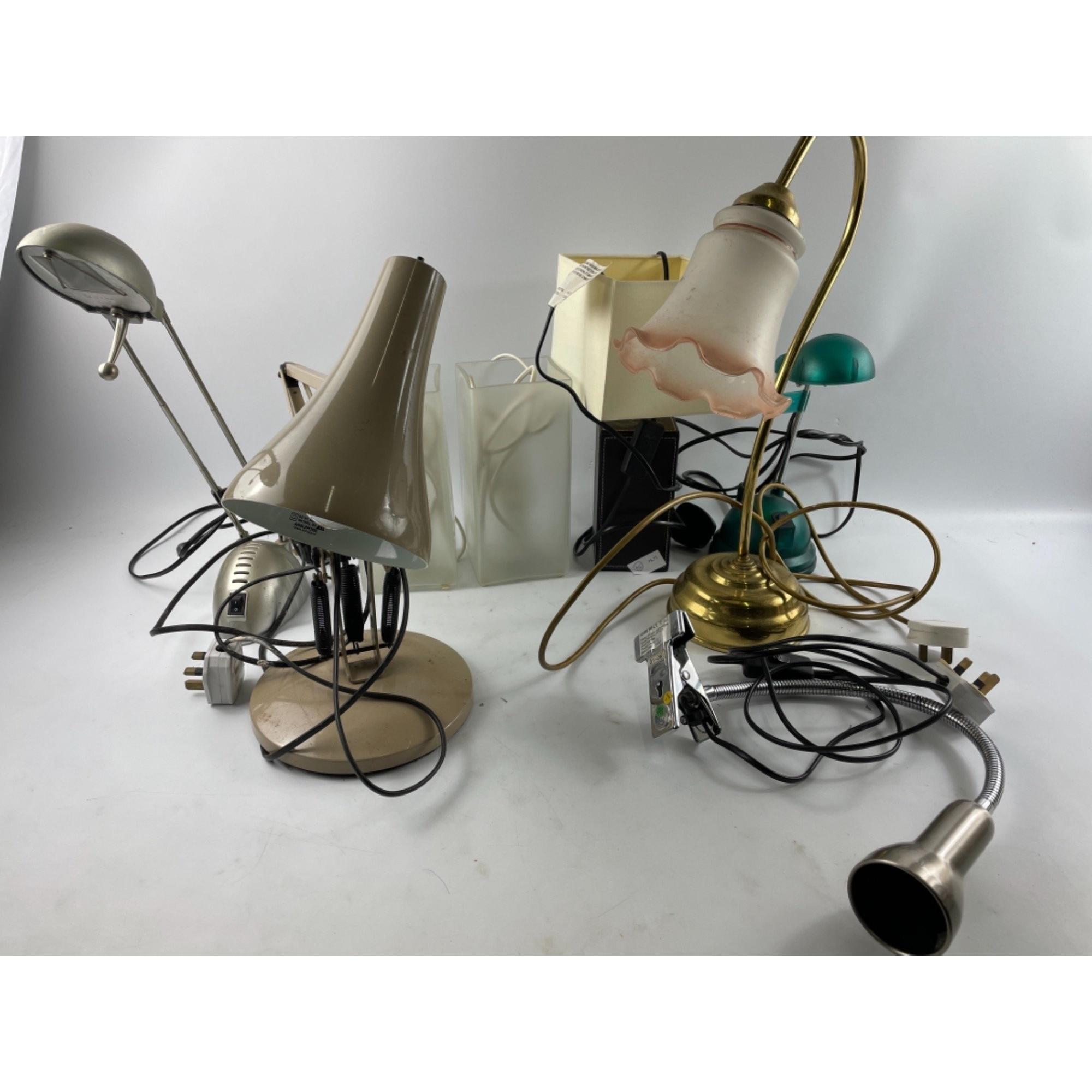 A mixed box of lamps to include AN ANGLEPOISE LAMP 80cm at a stretch, and also a nice brass table lamp with glass shade and much more