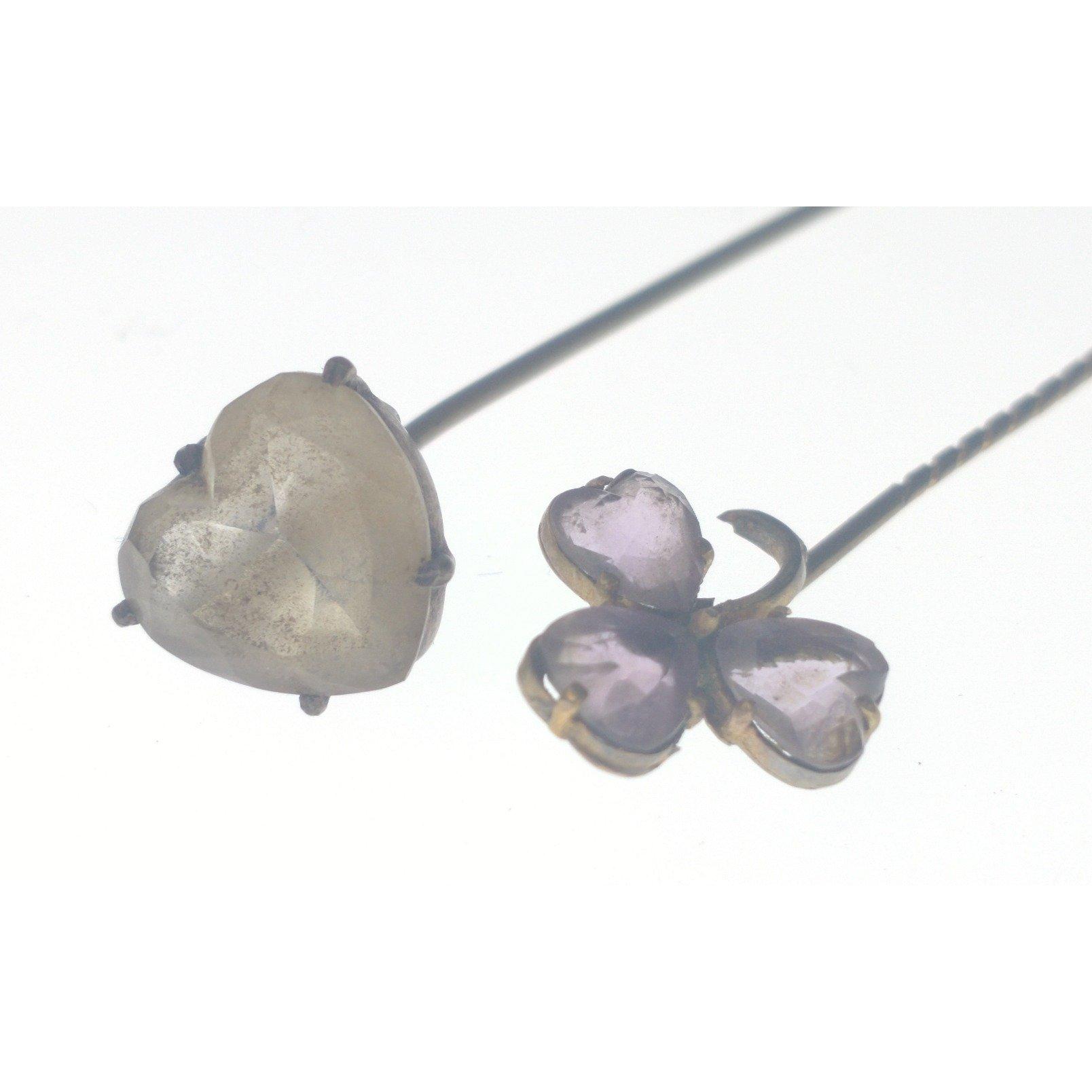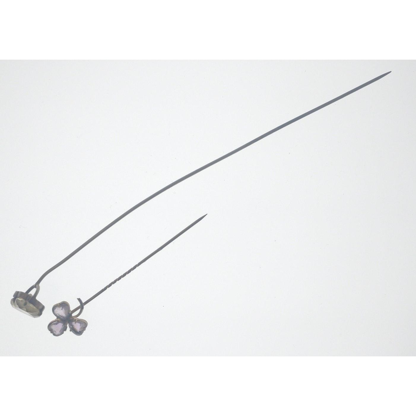 A VICTORIAN large 'yellow metal' hat pin with a heart shaped white stone inset 17.5cm long approx weight 3.50g approx, with also a small VINTAGE 'yellow metal' pin brooch in floral form with 3 small amethyst love heart shaped petals 7.5cm long approx weight gross 1.90g approx