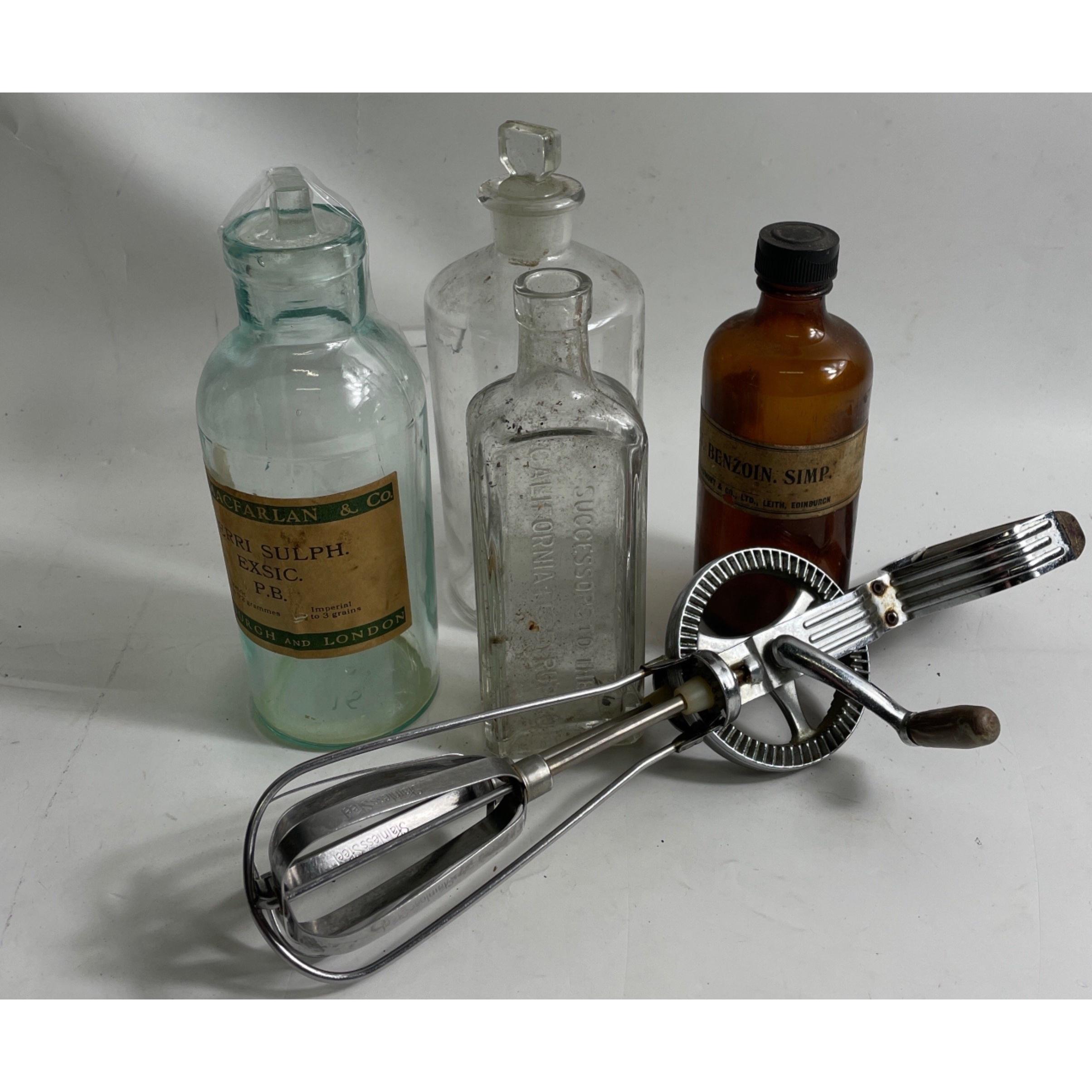 Box of vintage bottles including Macfarlane & Co Edinburgh chemists bottle with label & vintage hand whisk