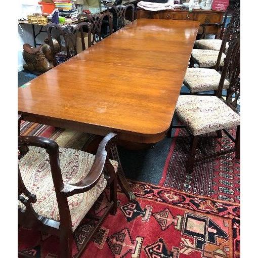 Large 12ft (including extensions) dining table with three extension leaves and six CHIPPENDALE INSPIRED dining chairs & two impressive carver dining chairs, all recovered around a year ago, table without extension leaves 7ft in length approx