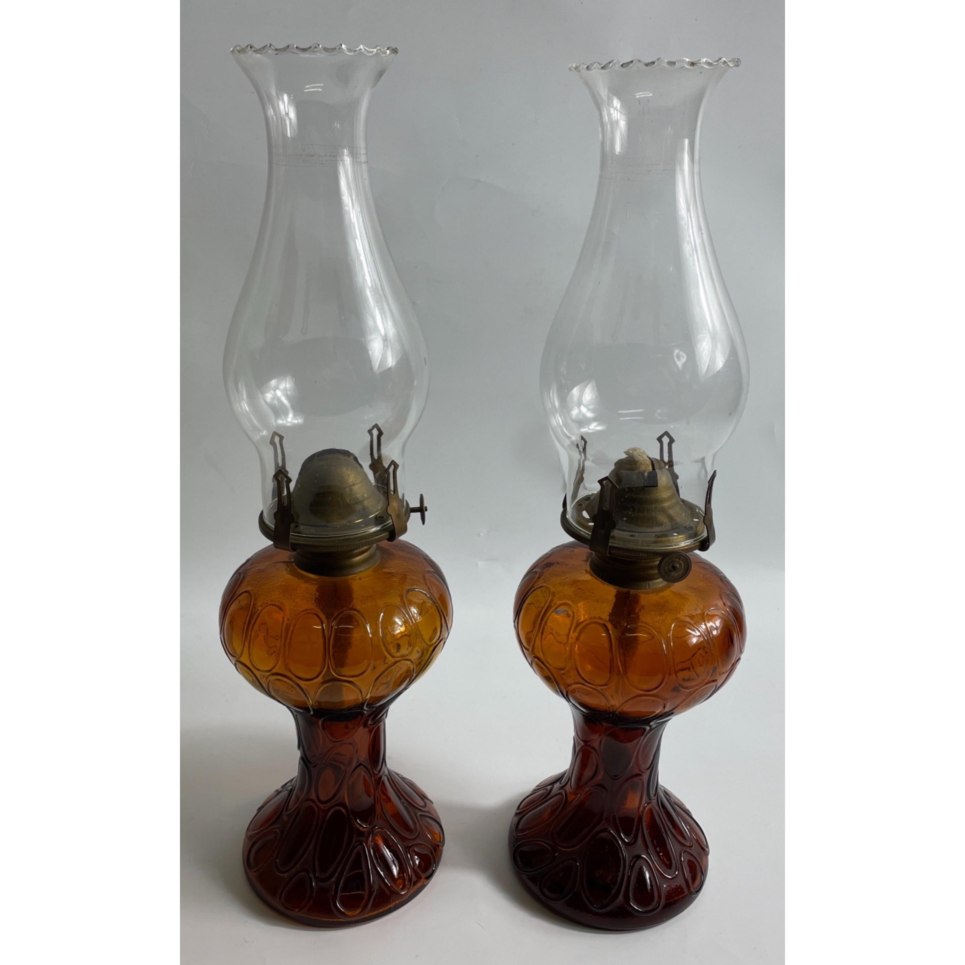 A pair of ANTIQUE brown glass reservoir 'half-size' oil lamps complete with glass funnels, height 35cm approx (just over 1ft in height). The wicks are in place ready for full use! Approx 2 pieces