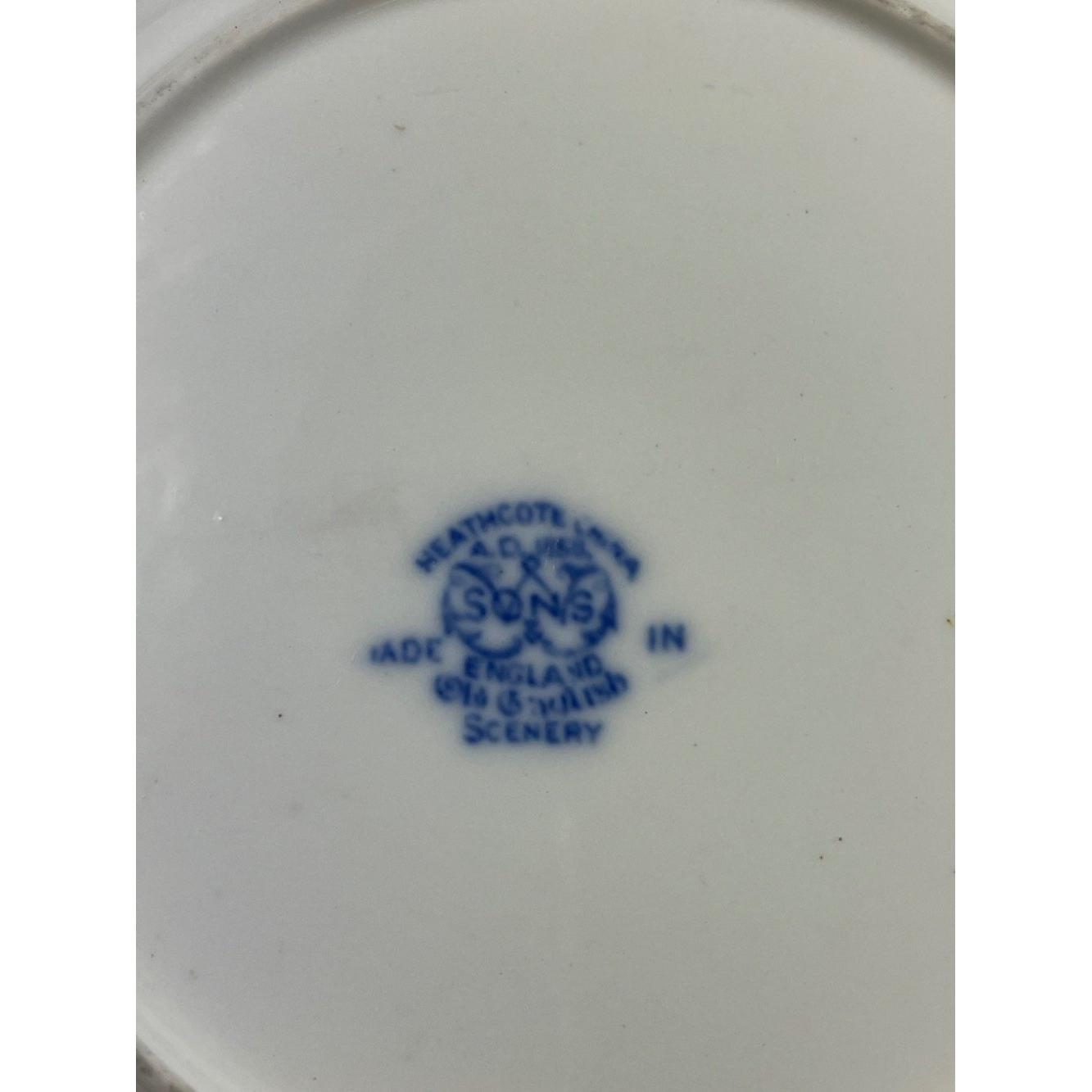A HEATHCOTE Old English Scenery tea service to include 6 side plates, 6 cups, 6 saucers 1 milk jug, some expected wear to the gilt rims, otherwise good condition, plus vintage 1 S. HANCOCK & SONS oval vegetable dish (24cm), and one at 26cm etc