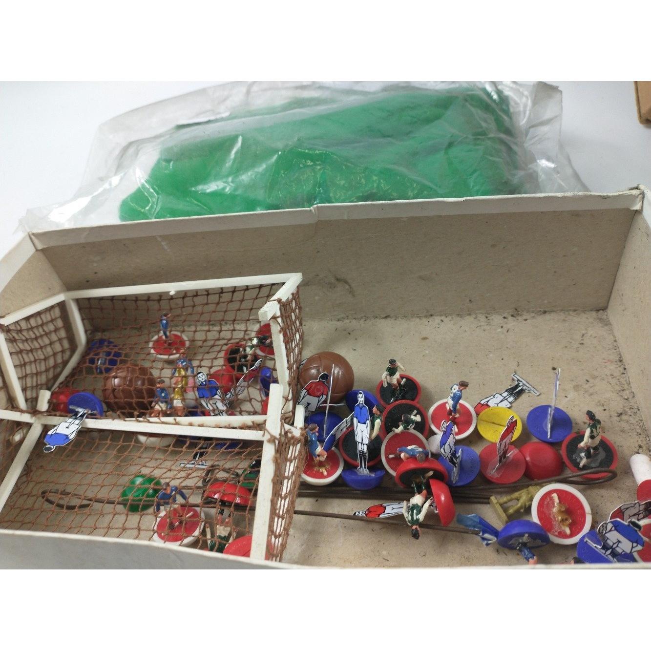 Box of vintage wooden building bricks together with a Fuller's Dundee cake tin full of early plastic construction pieces etc. and SUBBUTEO mat with two goal posts and some team players and balls