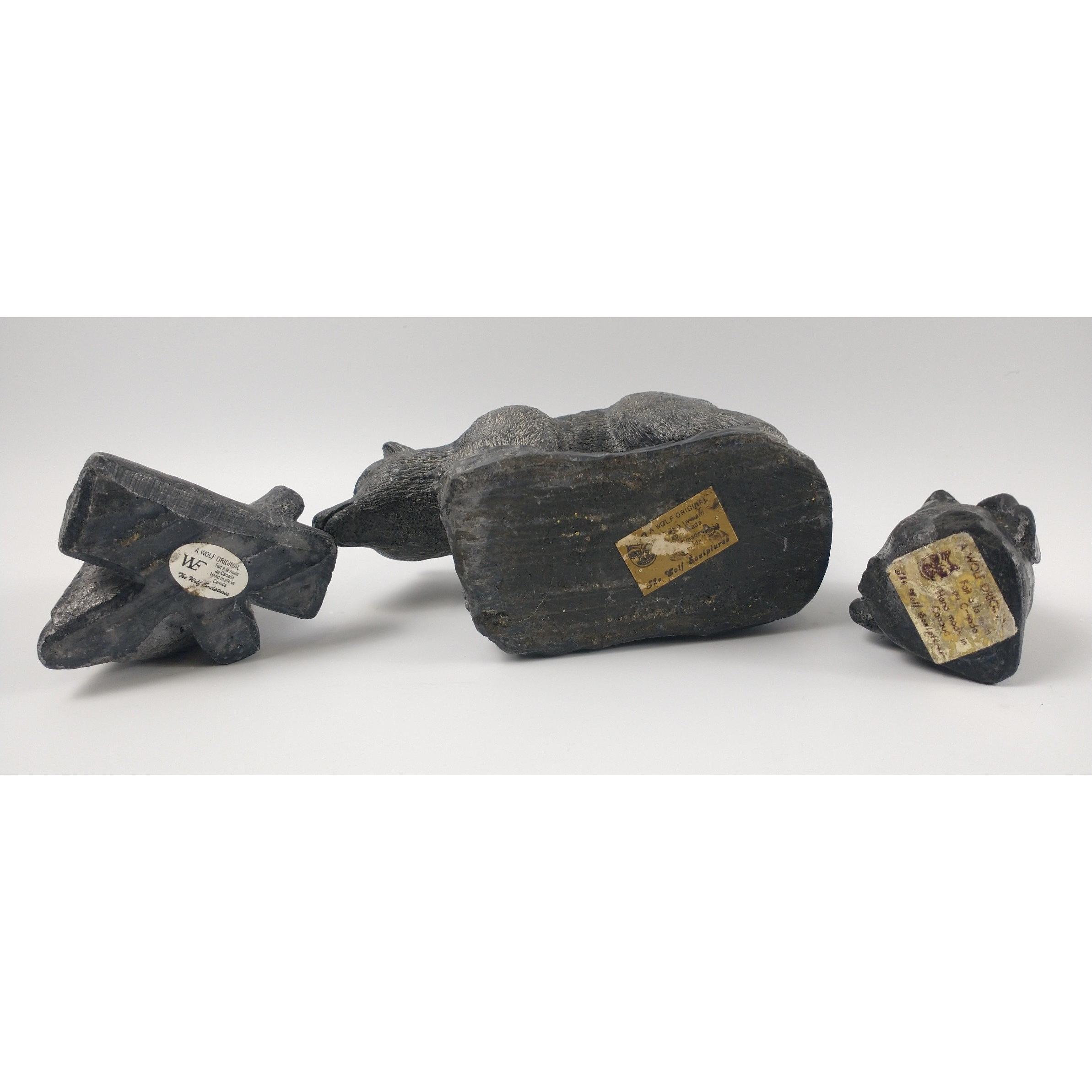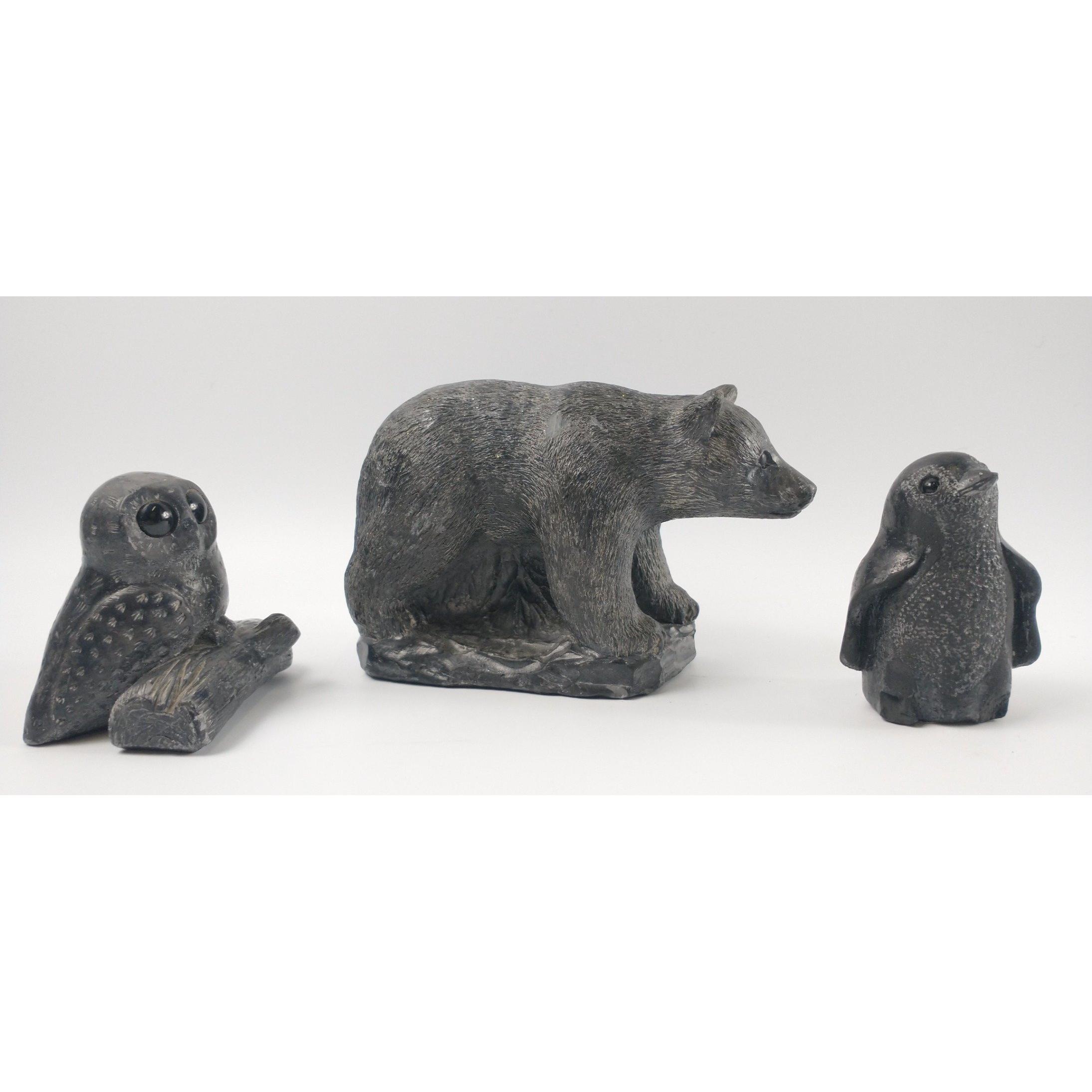 Three pieces of WOLF SCULPTURES (Canada) soapstone figurines to include a bear (9cm approx), an owl (7cm approx) and a penguin (7cm approx)Approx 3 pieces