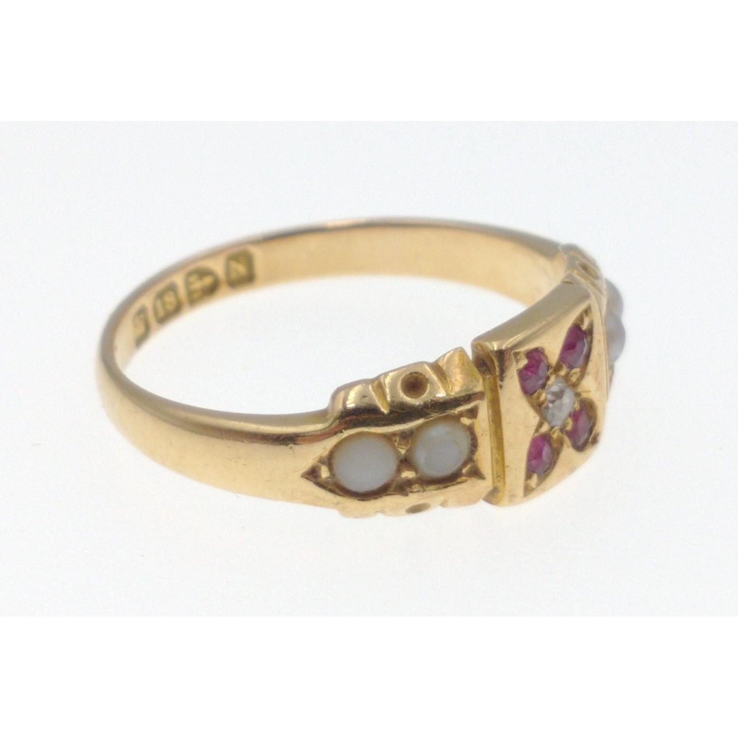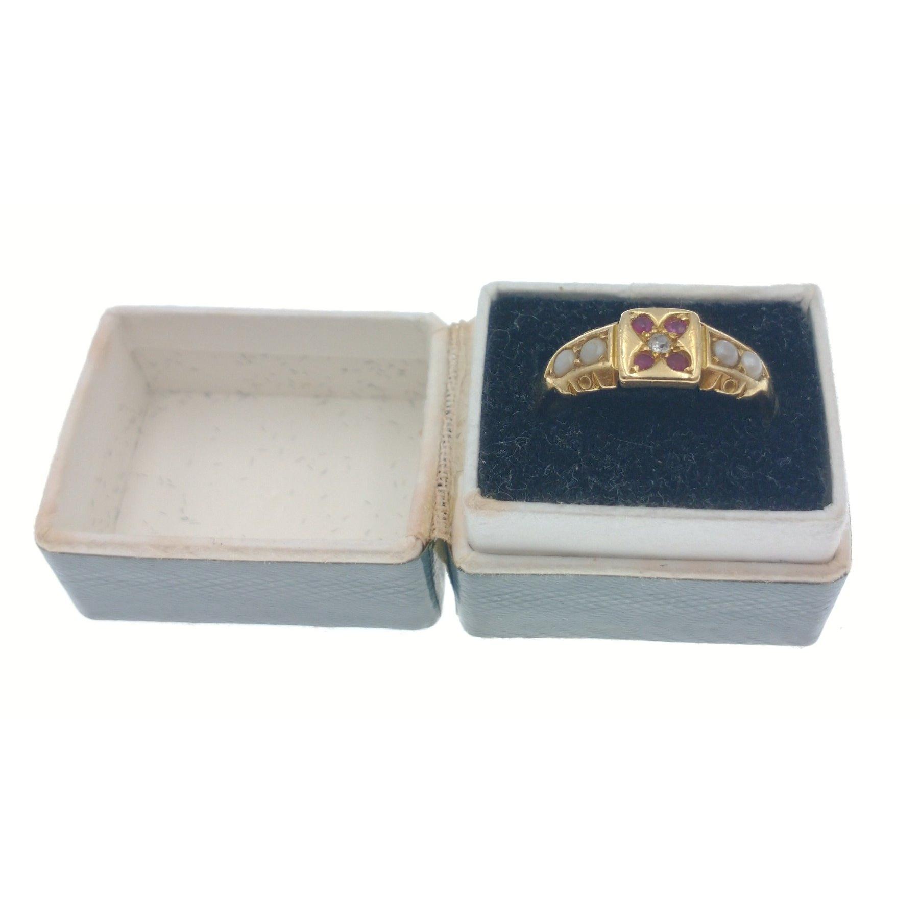 A VINTAGE 18ct stamped & Hallmarked yellow gold dress ring with four small garnets inset, a centred small diamond with two seed pearls on each shoulder 3g weight approx ring size M