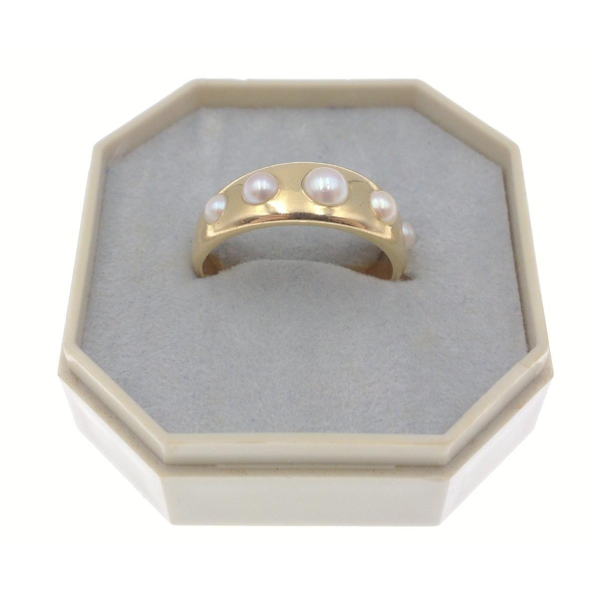 An 18ct stamped Birmingham yellow gold ladies dress ring with five pearls inset gross weight 4.92g approx ring size N/O Gross weight approx 4.92gApprox 1 pieces